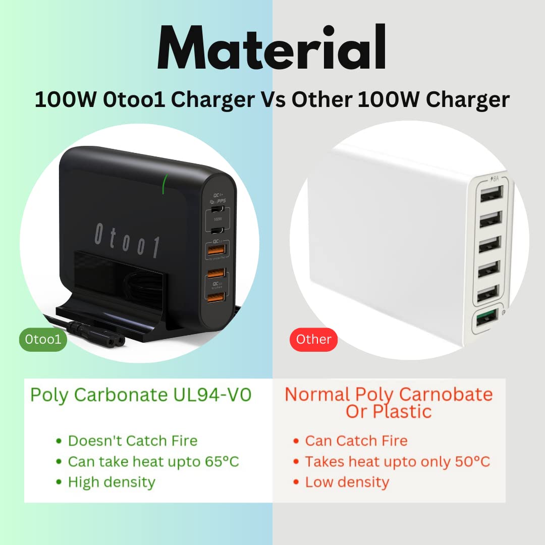 Power Input :- 100-240 -1.5A 50-60Hz Power Output :- USB C : 5/9/12/15V=3A, 20V=5A(Each) PPS:- 3.3-11V=3A, 3.3-16V=3A, 3.3-20V=3A(Each) USB-A: 3.6-6V=3A, 6-9V=2A, 9-12V=1.5A PD Charging :- USB-C Power Delivery (PD) is a fast charging technology, that delivers much higher levels of power than standard charging. With up to 100W of power available, USB-C PD can even charge larger devices, like tablets and laptops. All you need is the right wall charger and USB-C cable – and leave those heavy laptop power cables at home. QC Charging :- Qualcomm Quick Charge This technology powers your devices faster than conventional charging, allowing you to spend less time connected to outlets. As one of the most widely used of the fast charging technologies, Quick Charge is already in many smartphones. If your smartphone is Quick Charge 3.0-compatible, you can charge up to 80% in just 35 minutes. PPS Port :- PPS’ main advantage over other standards is its capability to lower conversion loss during charging. This means that less heat is generated, which lengthens the device battery’s lifespan. Warranty :- 0too1 Multi Port Laptop Charger Adapter 100 Watt 5 in 1 USB Port you get 1 year of warranty from the date of purchase, If there is any technical problem in the product you can contact our customer support team at +91-9773237134 or whats app us at the same number or you can even drop us an email – info@0too1.com