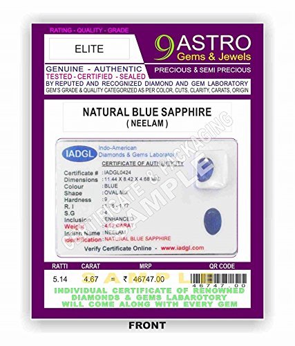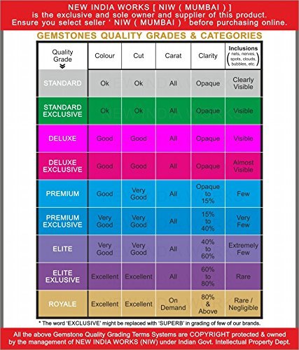 NOTE: This Gemstone is of STANDARD to ROYAL QUALITY measure by its Grade. Direct Visible Natural Inclusions like clouds, bands, bubbles, feathers, particles, spikes, veins, grains and dark spots are RARE(NEGLIGIBLE). This gem is mostly TRANSPARENT. 100% Genuine & Certified Natural Gemstone. Certified & Sealed by Reputed Indian & International Diamond & Gem Testing Laboratory. Further ‘9 ASTRO GEM & JEWELS’ grades and packs separately each and every gemstone according to its Quality Grades based on Cut, Carat, Colour, Clarity & Origin. Brand ‘9 ASTRO GEMS & JEWELS’ and all its grading standards and content(Copyright Registered) belongs to the Owners of NEW INDIA WORKS. BEWARE OF FAKE GEMSTONES, BY VERYFYING CERTIFICATE NUMBER ON RESPECTIVE LABORATORY WEBSITE, AND ENSURE THE PRODUCT CONTENT & PACKAGING LOOKS SIMILAR TO 2ND AND 3RD IMAGE PROVIDED ON WEBSITE. Our Different Quality Grades are Standard, Standard Exclusive, Delux, Delux Exclusive, Premium, Premium Exclusive, Elite, Elite Exclusive, Royale, Etc. [Images are Specimen]