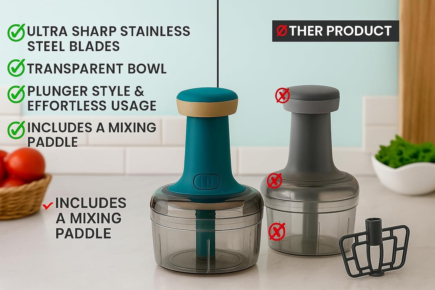 Compact & Easy to Use – Lightweight hand chopper with ergonomic handle and transparent container for easy food monitoring.