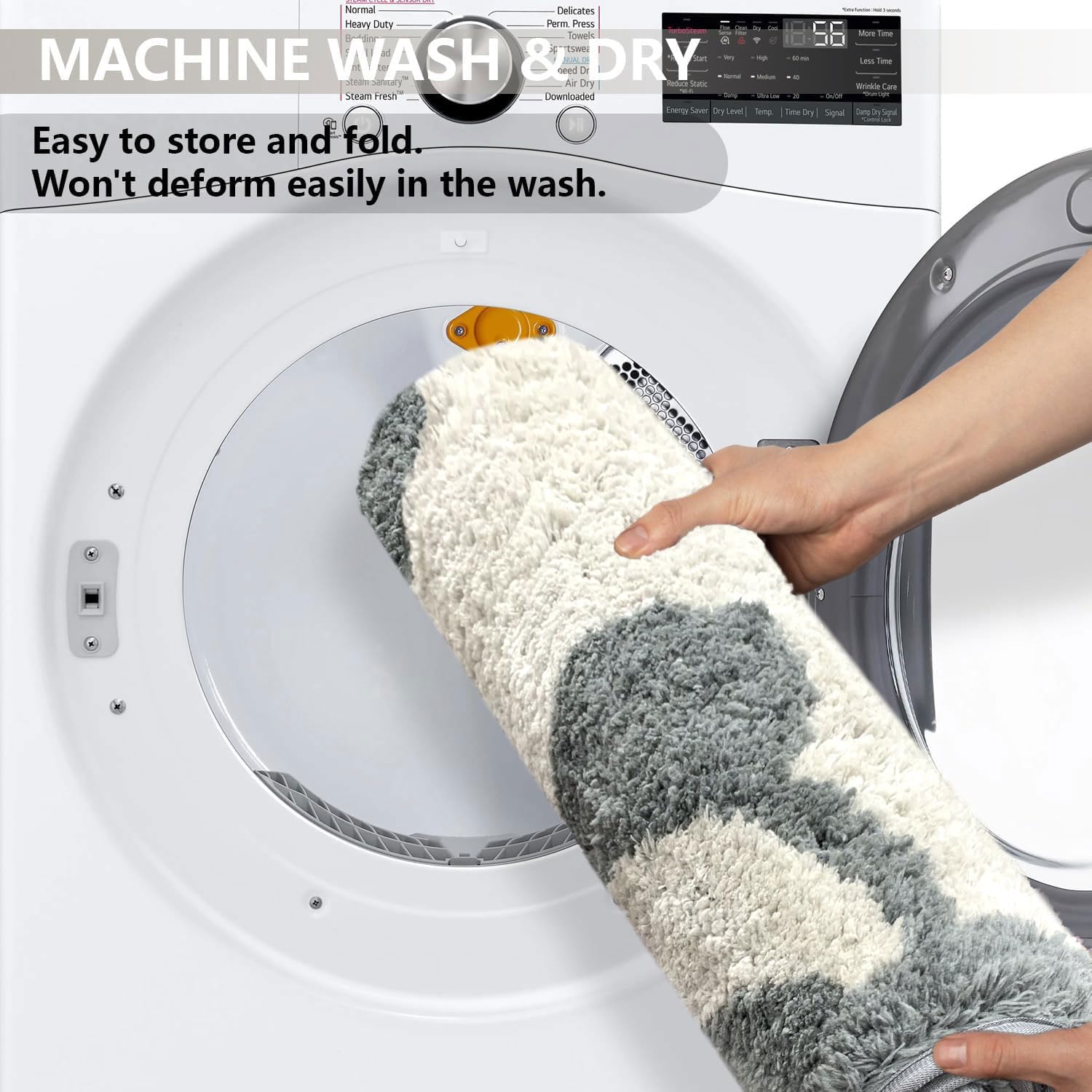WASHABLE – Bathroom mat is Easy to Clean. Machine Wash Separately with Cold Water and Mild Detergent (No Chlorine or Bleach) Tumble Dry at Low Speed or Hang Dry.