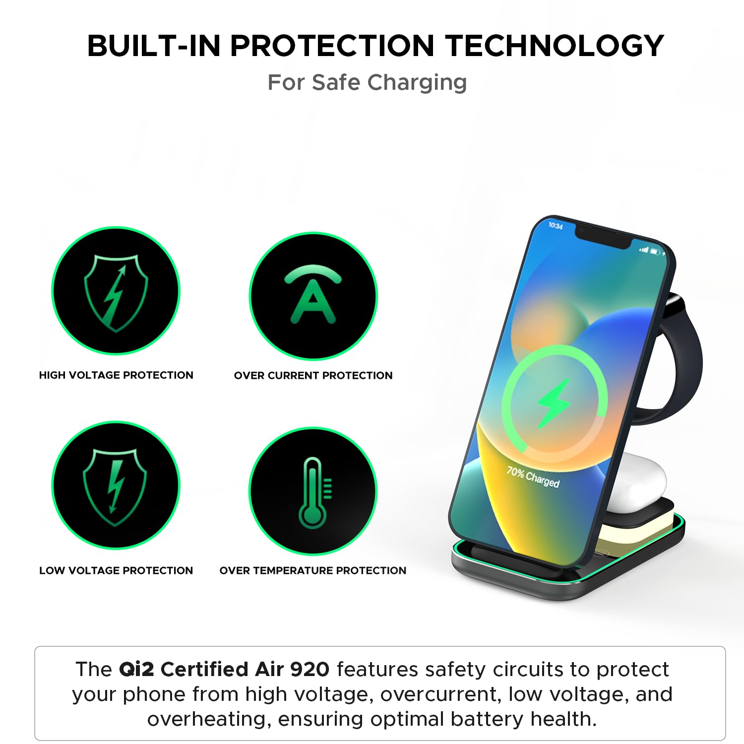 𝗤𝗶𝟮 𝗖𝗲𝗿𝘁𝗶𝗳𝗶𝗲𝗱 𝗦𝗮𝗳𝗲𝘁𝘆 𝗮𝗻𝗱 𝗘𝗳𝗳𝗶𝗰𝗶𝗲𝗻𝗰𝘆: Built with the latest Qi2 wireless charging standard, ensuring faster, more efficient, and safer charging with optimized power delivery and enhanced device protection.