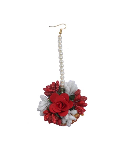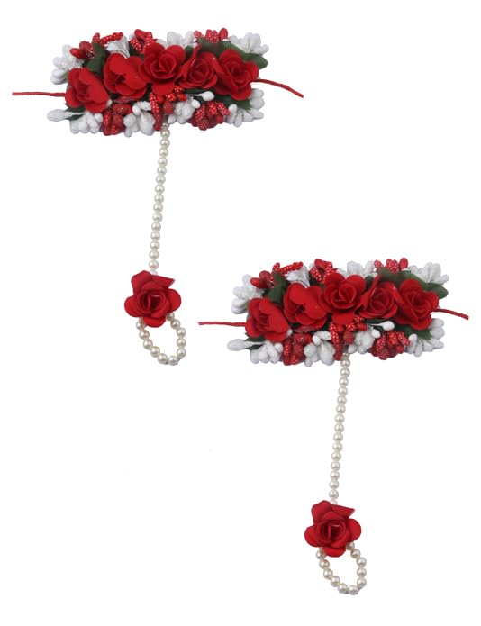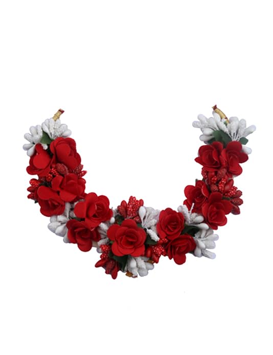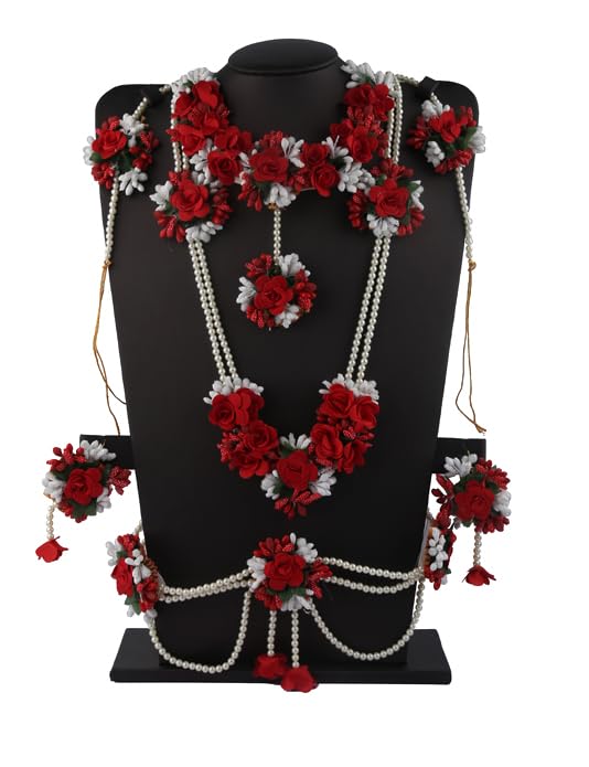 If you are searching for flower jewellery then you are at the right place. We offers a wide collection flower jewellery. This Red and White combination set is one of the jewellery pieces from Anuradha Plus. It woven with good quality pearl beads & flower. This necklace set is best pick for pre-wedding event such as ‘haldi’ & also for baby shower. It consists of necklace, pair of matching earrings, maang tika, single bajuband and pair of hath-phool. So order now!