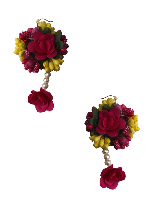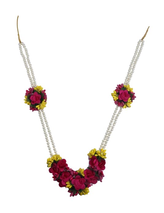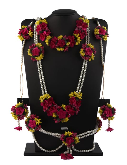 Anuradha Plus presents Pink and Yellow Colour bridal jewellery set for haldi ceremony and baby shower jewellery, if you are searching for flower jewellery then you are at the right place. We offer a wide collection flower jewellery. It consists of necklace, pair of maAPhing earrings, maang tika, single bajuband and pair of hath-phool. So order now!