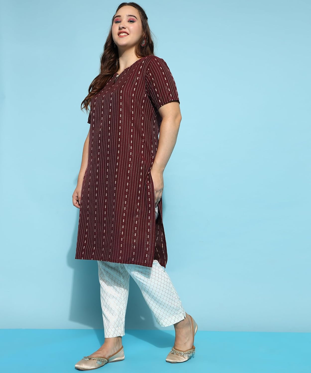 These lovely and chic kurti features a cotton fabric with prominent dobby design. The straight cut gives it a contemporary twist and makes it look more youthful. This is an ideal party wear for festivals.