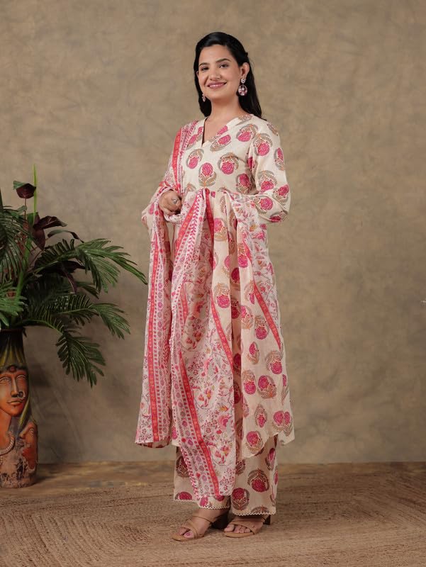 Aramya Soft Cotton Cream Straight Floral Print Office or Casual Wear Kurta Set with Dupatta for Women | Available in Plus Sizes, M to 10XL
