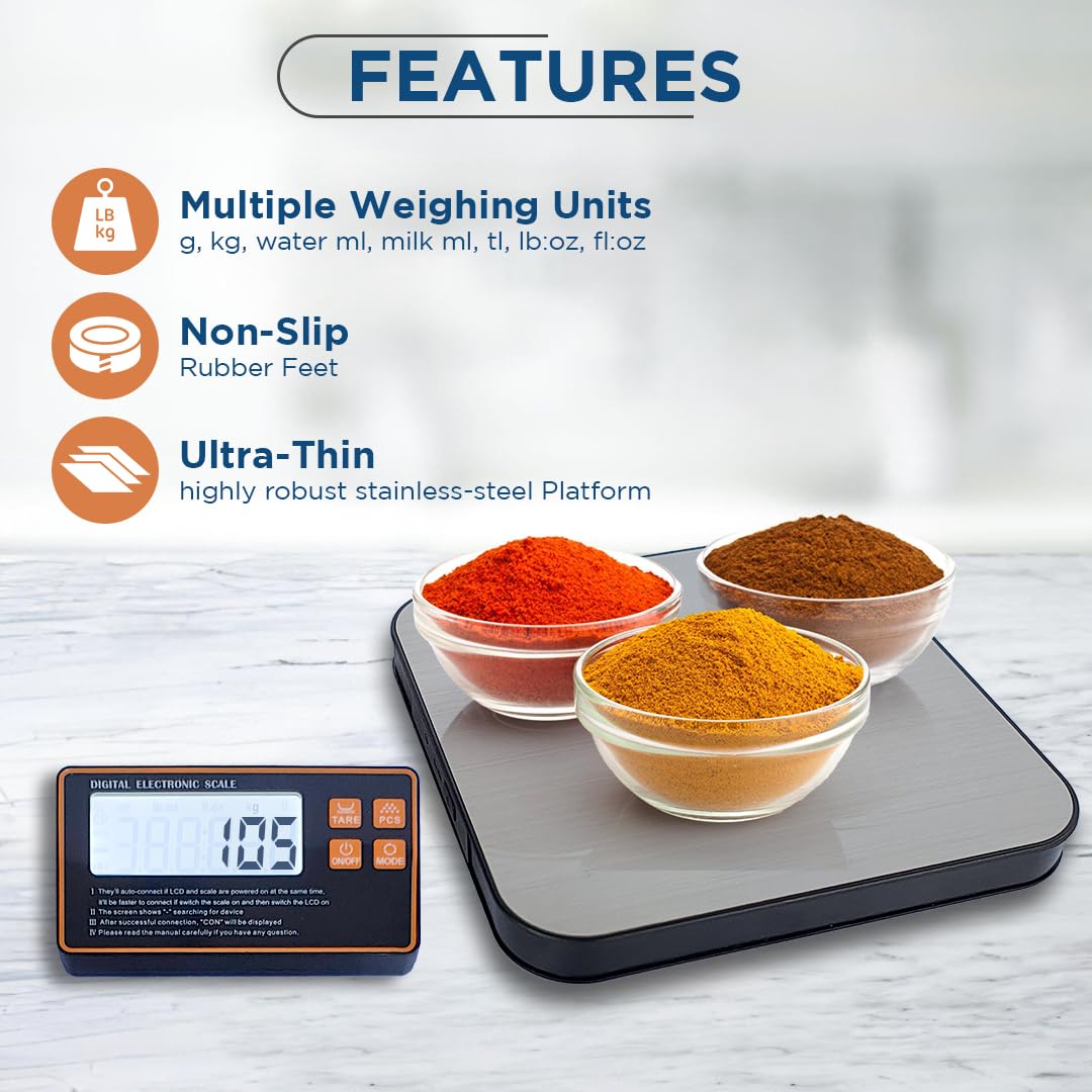 Introducing an innovative kitchen food scale with a wireless design that separates the weighing area and display.Say goodbye to obstructed readingsfrom oversized items or needing a larger scale for bulky ingredients. This wireless scale offers the ultimate convenience for weighing both small and large items, ensuring accurate measurements every time.Its compact and portable design makes it the perfect tool for any kitchen.