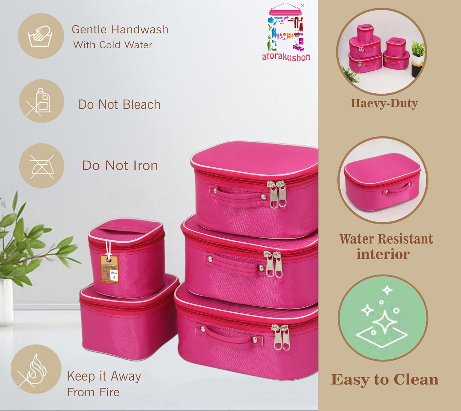 DIMENSION AND COLOR : Pink, Nylon Fabric Box Pouches, Durable, Portable, Sophisticated and Stylish Makeup jewelry Bag, Convenient Jewelry Packing organizer Product, Dimensions Set of the 5 Box are as follows Pouch 1:- Pack 1: 23 x 18 x 9 cm Pack 2: 21 x 16 x 8 cm Pack 3: 19 x 14 x 8 cm Pack 4: 12 x 12 x 8 cm Pack 5: 10 x 10 x 8 cm, cosmetic necklace earring zipper box for any stuff TOTAL 5 BOXES, Very competitive rates zip closure