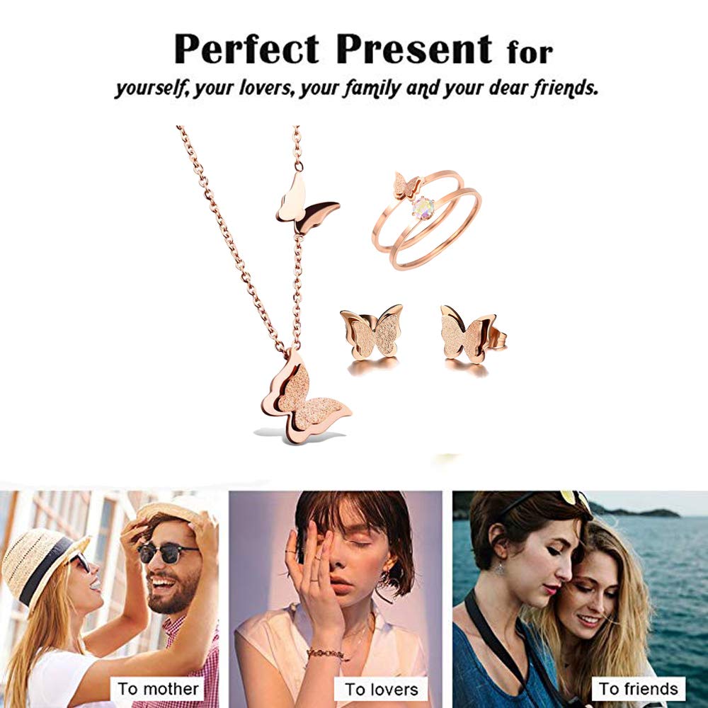 3.BAFOME 18k Rose Gold Stainless steel Butterfly Jewelry Set Necklace Ring Stud Earrings for Women Girl Christmas Gift