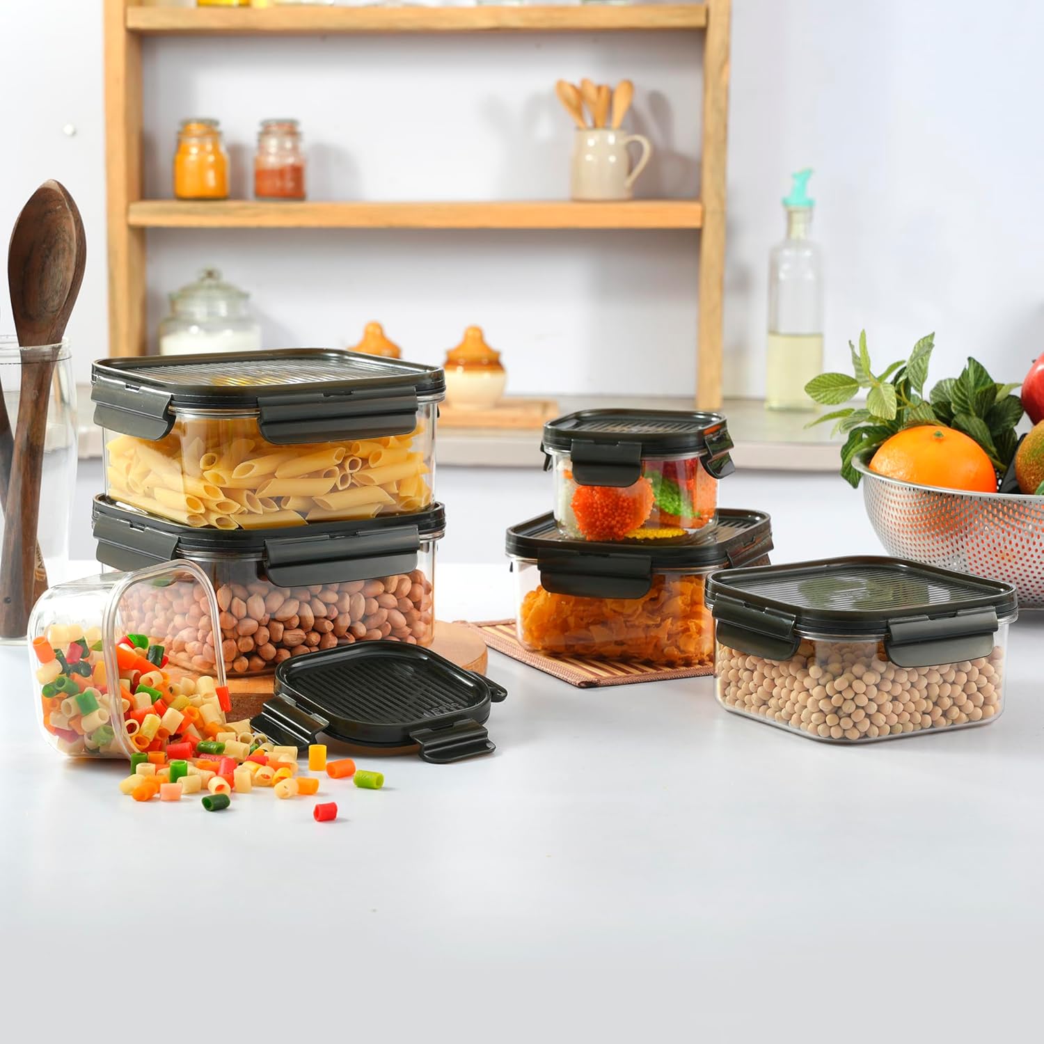 🔒 Airtight & Leakproof Design – Each container features a secure airtight lid that locks in freshness and prevents moisture from entering. Ideal for storing dry foods like grains, pulses, cookies, and snacks.