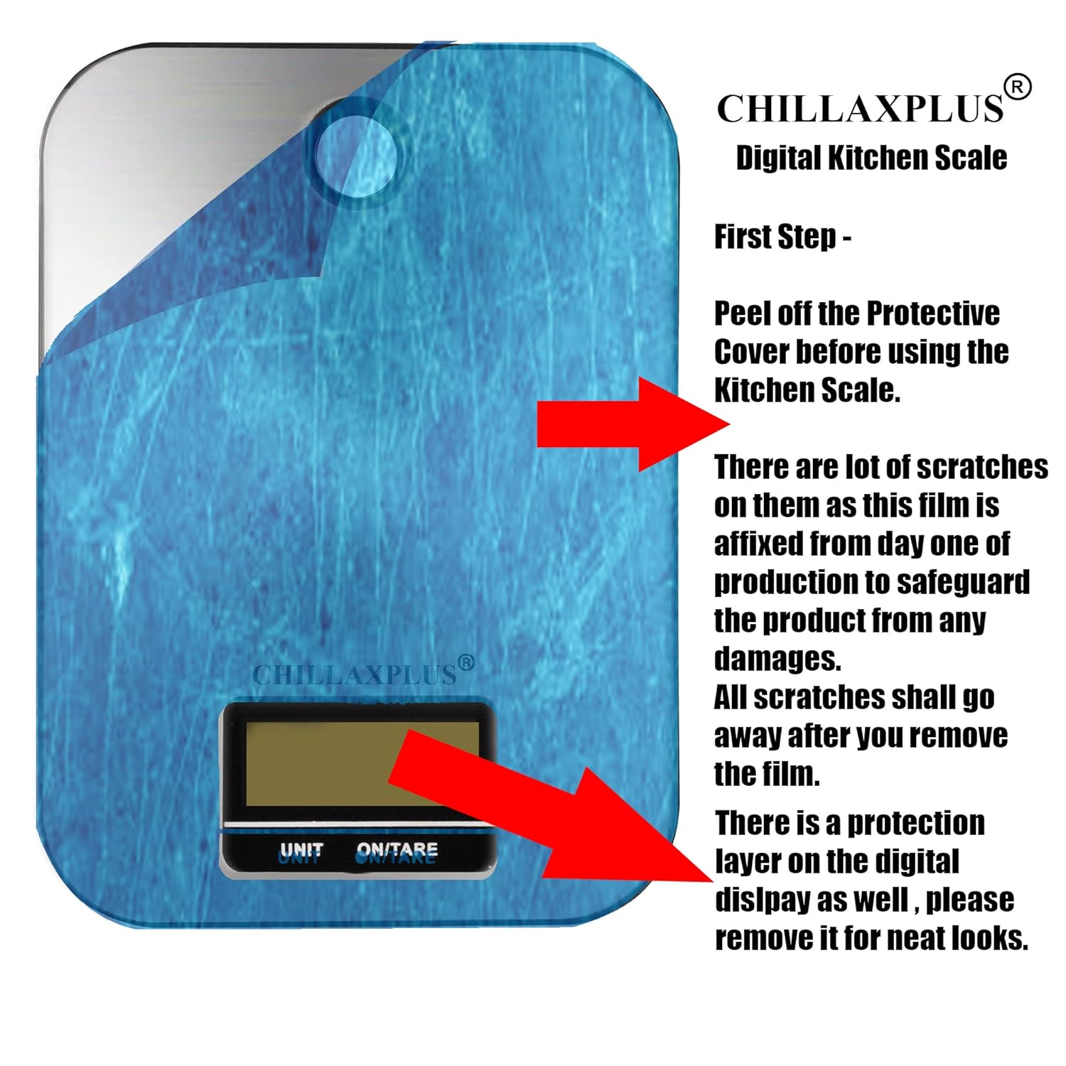 Protective Film : To safeguard the steel surface , a protective film is added in the process of production. There are sometimes scratches on the this film as these are handled during production. Please remove the film before use. You shall be able to see the original color of the kitchen scale after removing the protective film.