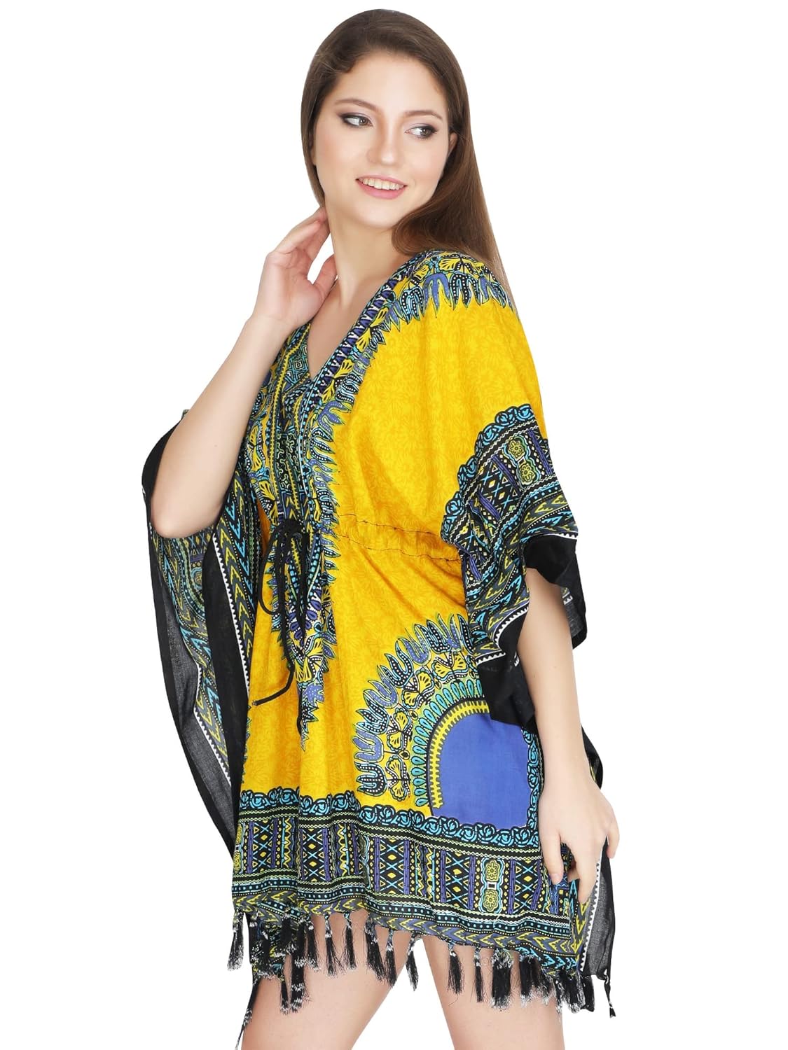 Cigain Polyester Women’s Short Dashiki Print Kaftan Dress Beach Wear Kimono Nighty (Yellow)