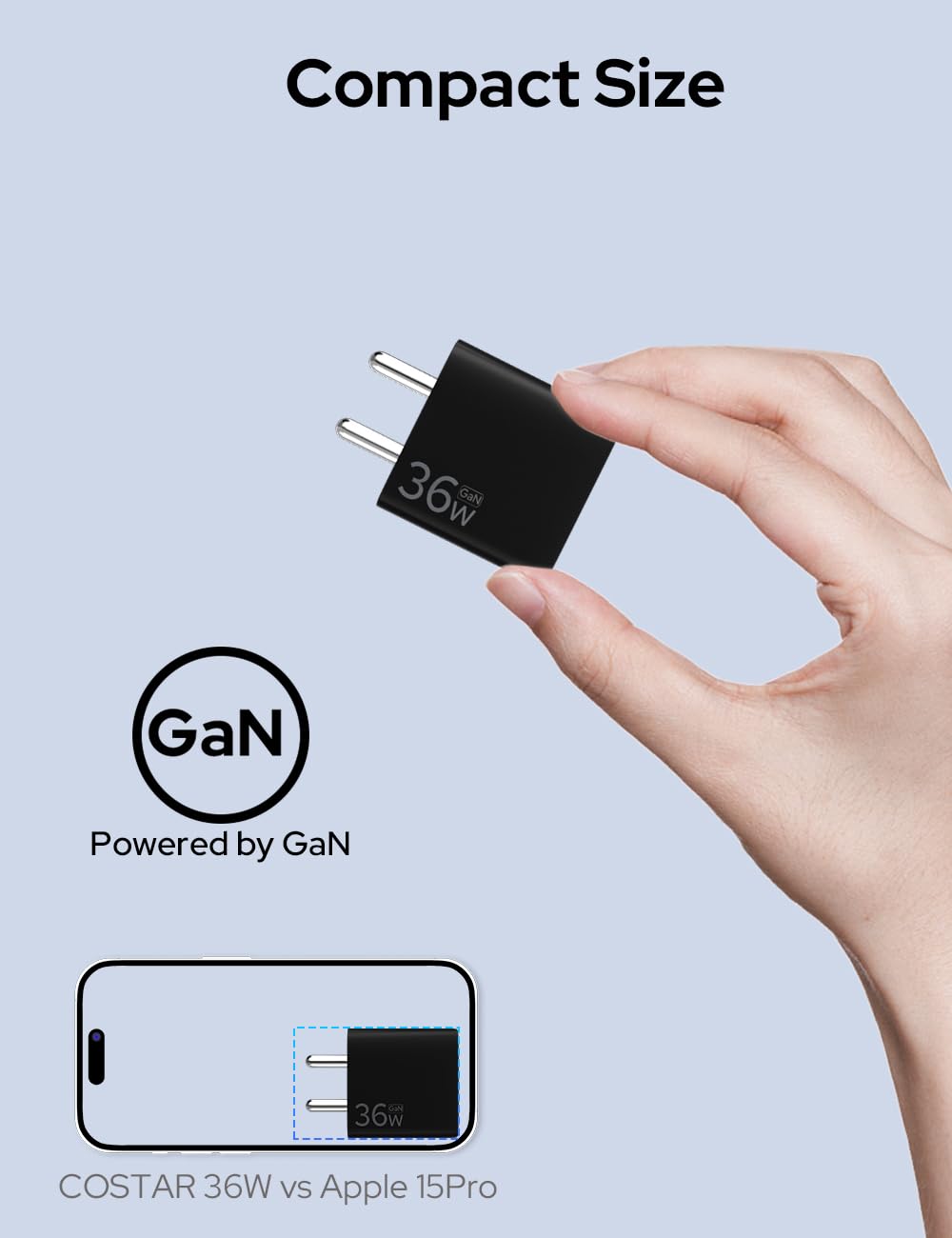⚡【Revolutionary GaN Technology for Fast Charging】Upgrade your charging experience with our 36W GaN-powered iPhone charger. Harnessing the power of GaN technology, this charger delivers unparalleled speed, charging your iPhone to 50% in just 30 minutes. And GaN technology allows for reduced heat generation and energy loss, ensuring a longer lifespan for your devices and eliminating overheating concerns.