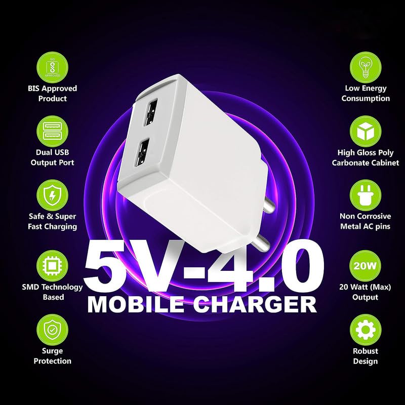 About this item Portronics Adapto 100 4A 20w Dual USB Port 5V/4A Wall Charger,Comes with 1M Micro USB Cable. Intelligent Protection • It also automatically stops charging, when the device is fully charged, The adaptor comes with intelligent protection, which prevents over current, short circuit, overheating, and keeps the device temperature controlled Lightweight & Portable: • Anselmo Global products, the Adapto 100 is also extremely portable, and lightweight. It is a wonderful travel accessory to save you from the hassle of carrying multiple adaptors SAFE, DURABLE & RELIABLE It auto detects and delivers the optimal charging power to connected device. This device has Fire Retardant body, is BIS Approved, and protects from over-heating, over-current, over-charging