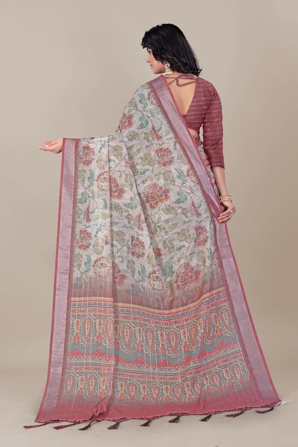 Crafted from a premium cotton linen fabric, this saree offers both comfort and style for extended wear. The intricate Banarasi weaving technique showcases beautiful geometric patterns along the border, while the pallu features classic motifs that exemplify traditional craftsmanship. The saree comes with elegant tasselled edges that add movement and grace to your ensemble. Perfect for festivals, celebrations, or special occasions, this saree can be styled with traditional jewellery and accessories to create a complete look.