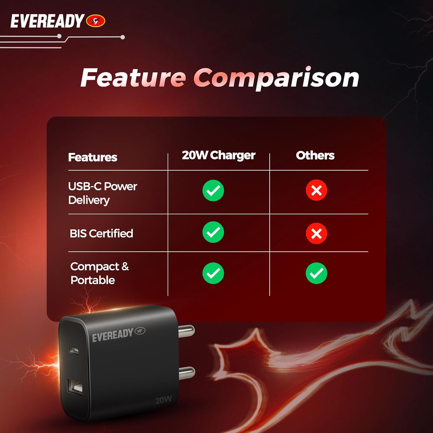 The EVEREADY 20W Fast Charger is designed to deliver efficient and reliable charging performance with universal compatibility and cutting-edge technology. Perfect for everyday use, it supports both Power Delivery (PD) and Quick Charge (QC) protocols, making it ideal for fast charging multiple devices on the go or at home. With dual output ports, this charger allows you to charge two devices simultaneously without compromising on speed. It supports a wide range of fast-charging standards including PD2.0/3.0, QC2.0/3.0, SCP, FCP, AFC, and Apple 2.4A, ensuring broad compatibility across smartphones, tablets, and other USB-C powered devices. Crafted for modern needs, the charger features complete protection against overvoltage & overload at output for added safety and is BIS certified—reinforcing its trustworthiness and quality. Its sleek and compact design makes it easy to carry, whether you’re traveling, working at your desk, or charging overnight at home. Built to meet the demands of a fast-paced digital lifestyle, the EVEREADY 20W Fast Charger combines speed, safety, and style—all in one powerful package. And with a 12-month warranty and a “Made in India” assurance, it’s a dependable charging solution backed by a legacy of performance.