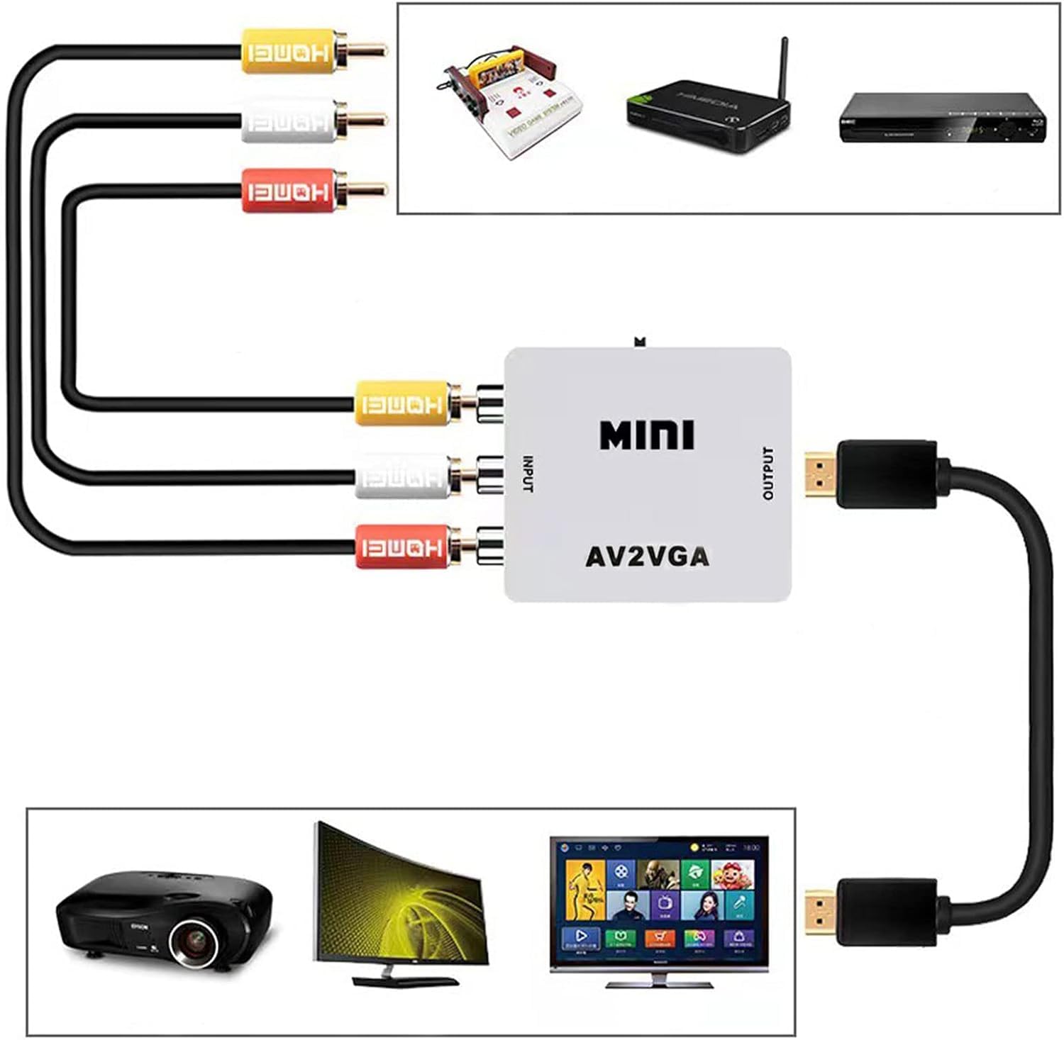 AV to VGA Converter: the video converter is connected to a display device with VGA interface, used for the old AV red yellow white interface to monitor the set-top box DVD recorder and convert the AV video signal to VGA, irreversible