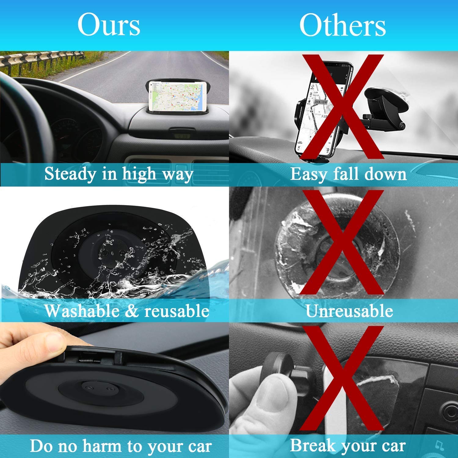 ★ 【WASHABLE, REUSABLE AND SUPER STICKY GEL PAD】Large silica gel base, plus a circle of adhesive silicone film can be washable and reusable. The concave silicone base is anti-slip and firmly held. Wash the base with water when you want to move it to another car, and then install it follow the installation steps.