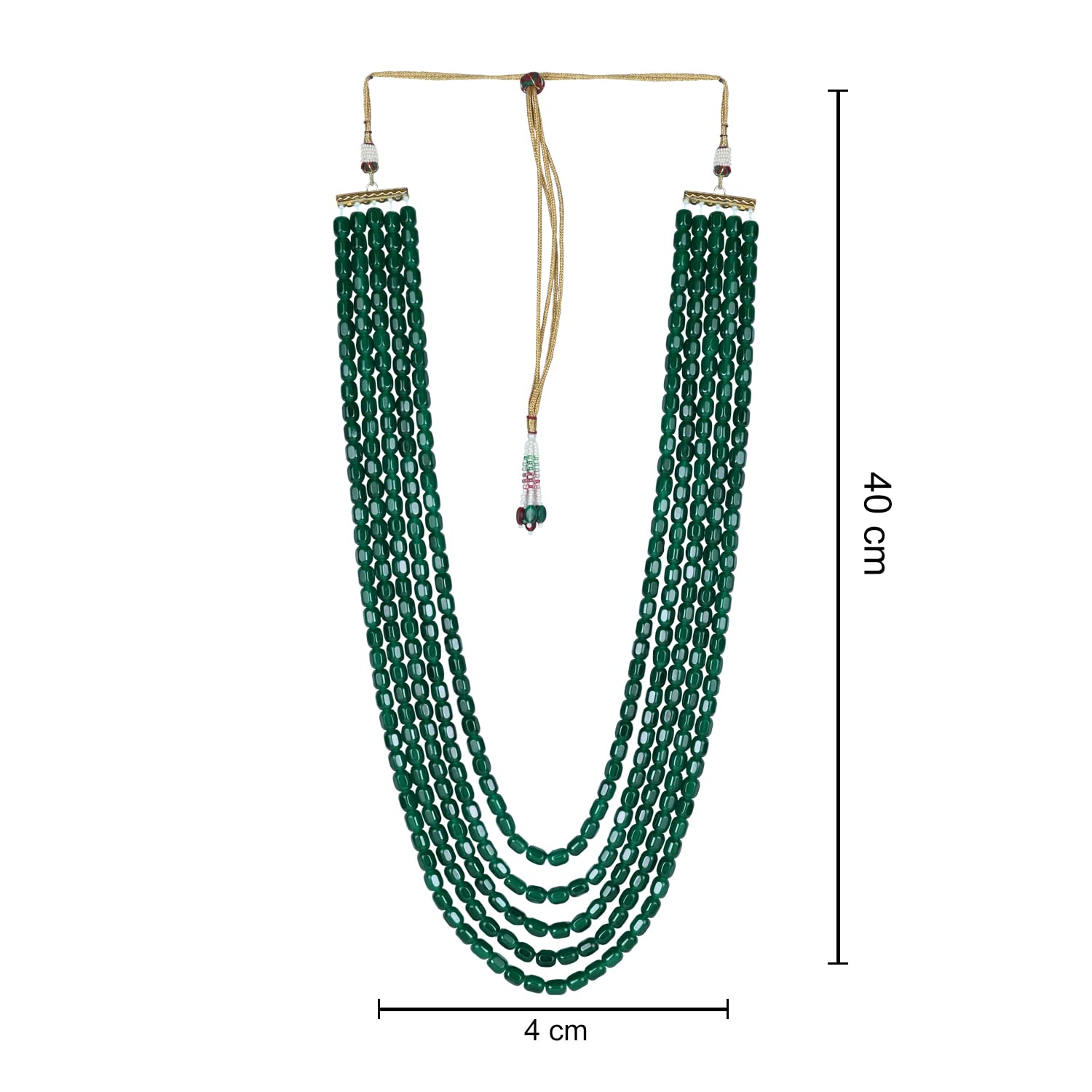 Introducing the I Jewels multi Layered Traditional Gold Plated Dulha Moti Mala with Beaded Maharaja Haar, the perfect accessory for any groom looking to add a touch of traditional elegance to their wedding attire. This stunning necklace for men is made of high-quality materials and features a traditional design that is sure to impress. The necklace is crafted with multiple layers of golden chains and pearls, creating a luxurious and sophisticated look. The centerpiece of the necklace is a beautiful beaded Maharaja Haar, adding an extra touch of regal style to the overall design. The necklace is gold-plated for a rich and authentic look, and the beads are carefully selected and arranged to create a stunning visual effect. The necklace is easy to wear and adjust, making it comfortable for the groom to wear throughout the wedding day.