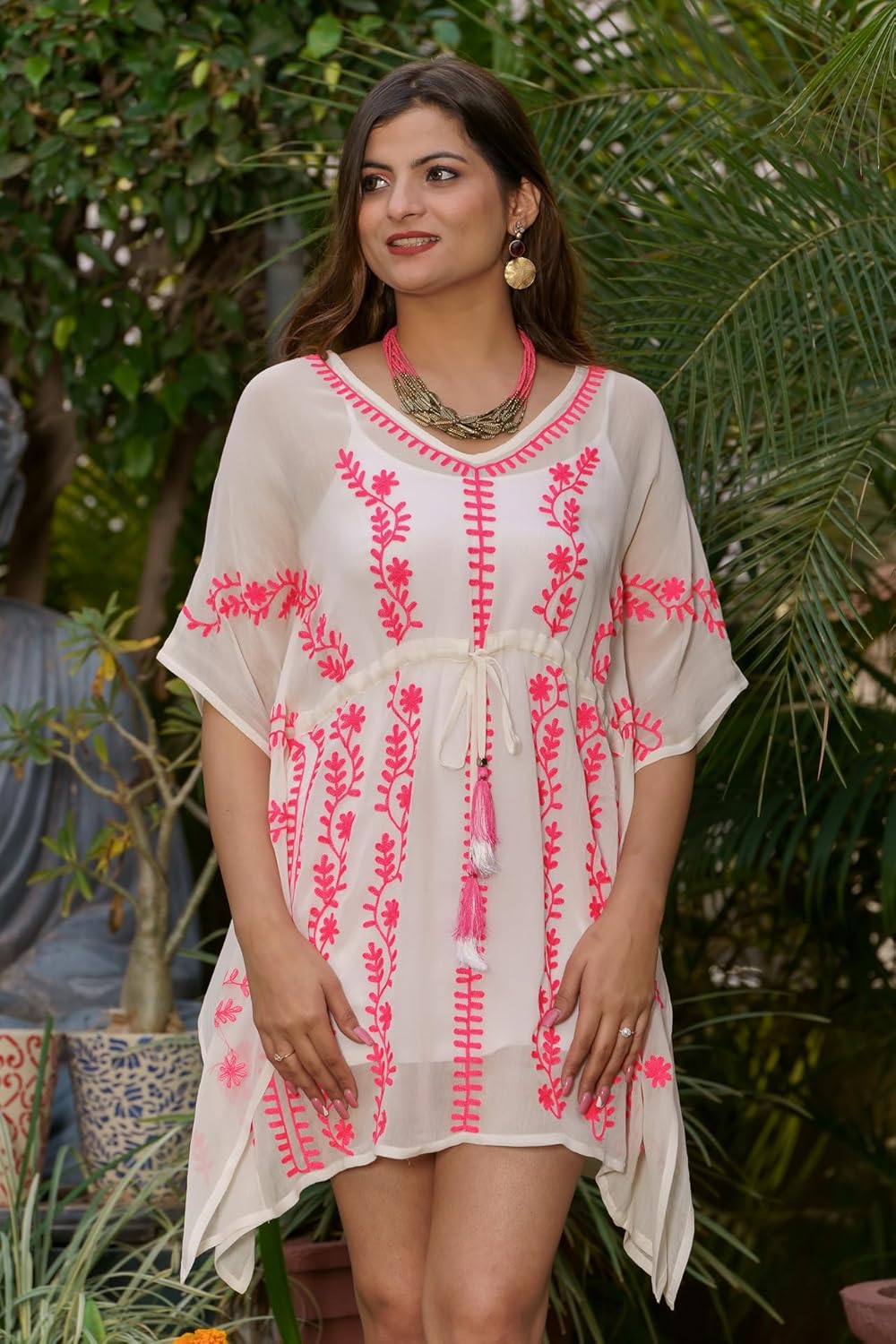 Enriching embroidered kaftan in georgette is all what you need! Lining in shantoon. Comfy and stylish in equal parts, this ensemble is a soothing hued beauty. Beautiful handcrafted kaftan with aari embroidery & dori at the waist with tassels. Comes with a seprate shantoon spaghetti strap slip.