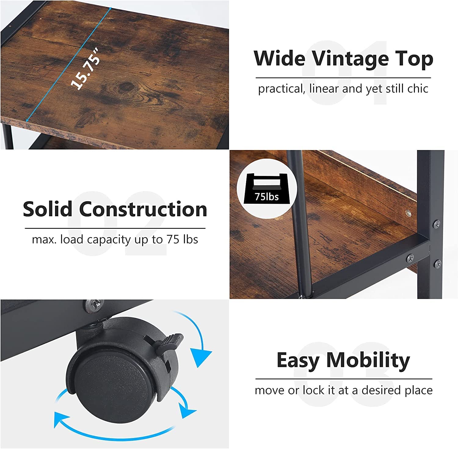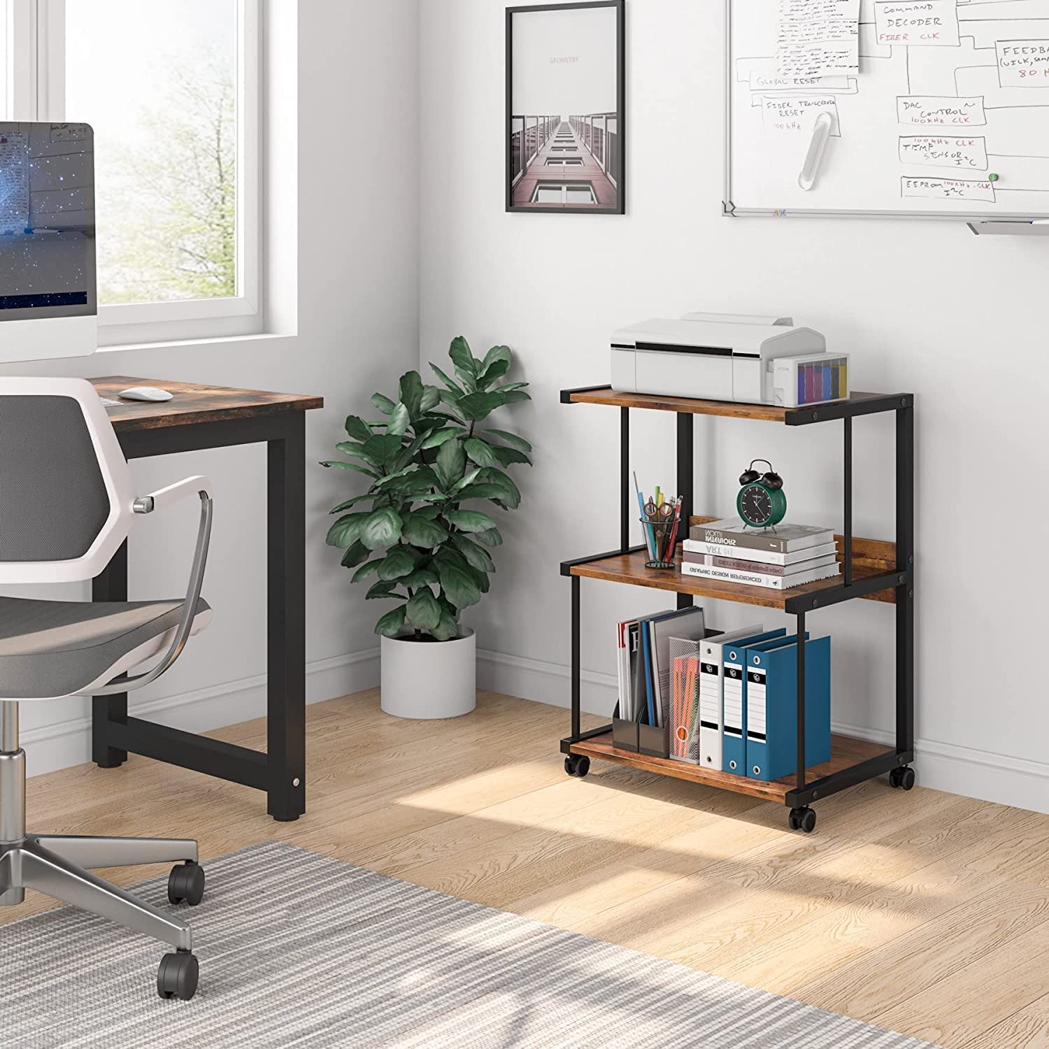 ELEGANT & VERSATILE: Save valuable space and gain mobility for your printer, scanner, fax machine with this multipurpose printer stand which has a industrial chic to complement most decors. It can also be used as a end table, storage shelf, bookcase or kitchen cart for both home office and commercial use.