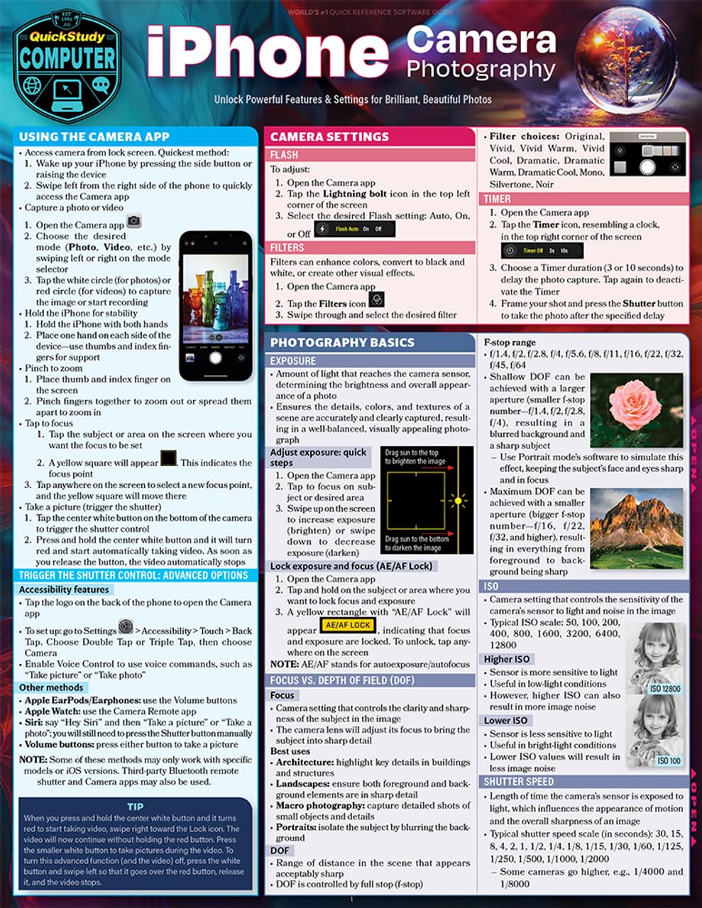 6 page laminated guide includes: Using the Camera App Trigger the Shutter Control: Advanced Options Camera Settings Flash Filters Timer Photography Basics Exposure Focus vs. Depth of Field (DOF) ISO Shutter Speed White Balance Choices Lens Types Telephoto Wide Angle Modes Burst Mode Night Mode Panorama Mode Portrait Mode Live Photos Characteristics Best Uses Advantages Disadvantages Simulate Long-Exposure Effect Optical Zoom Characteristics How to Use Advantages Disadvantages Composition: Creating Visual Interest Balance, Color Contrast Diagonal Lines Eye Contact Fill the Frame, Frame within a Frame Juxtaposition Layers, Leading Lines Negative Space Pattern and Repetition Point of View, Rule of Thirds Simplicity, Symmetry Texture Breaking the Rules Video Quick Start Native Controls Basic Techniques Advanced Techniques Postproduction Pro TIPS Fun ideas for Great Pics