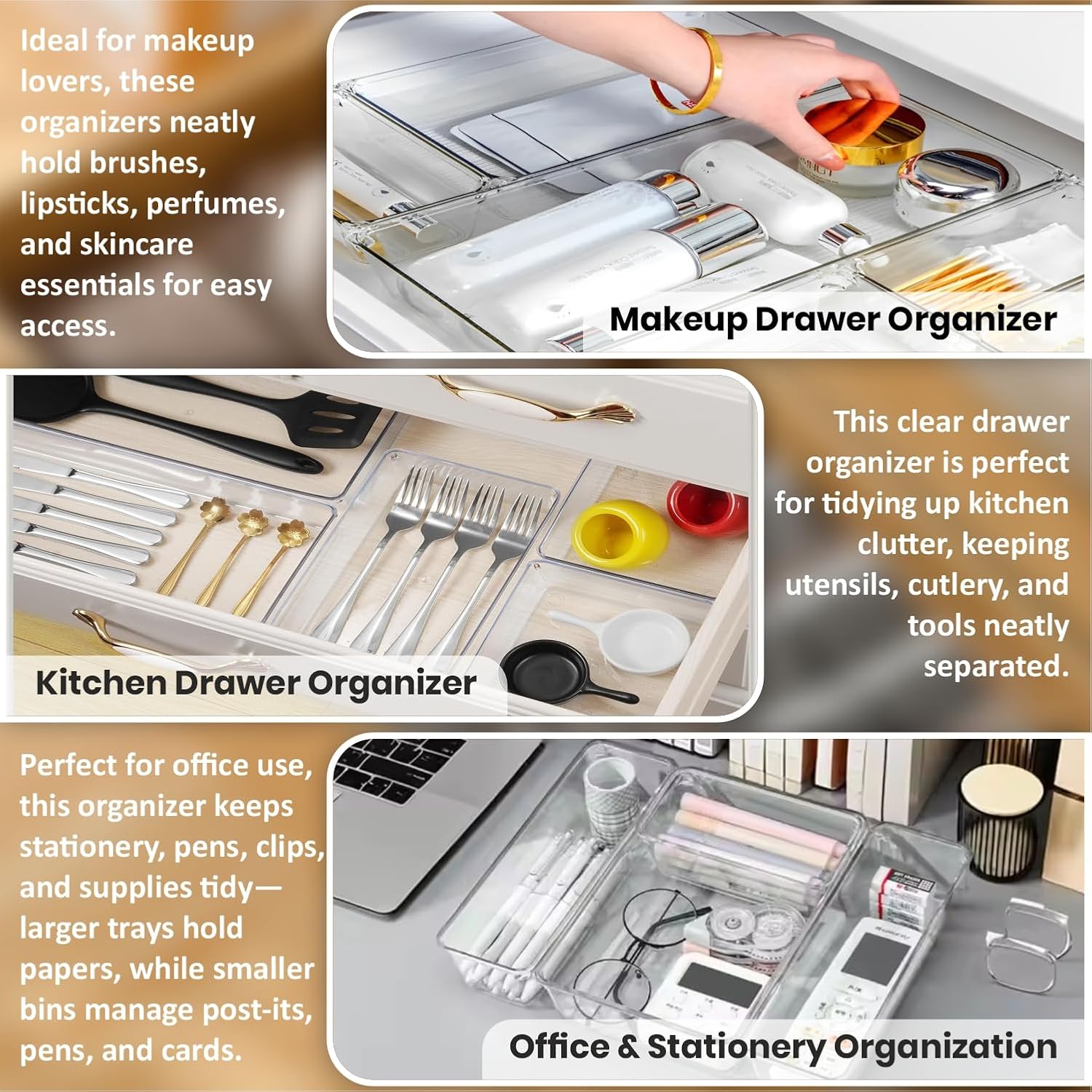 𝟒 𝐃𝐈𝐅𝐅𝐄𝐑𝐄𝐍𝐓 𝐒𝐈𝐙𝐄𝐒 𝐓𝐑𝐀𝐘 𝐅𝐎𝐑 𝐀𝐒 𝐘𝐎𝐔𝐑 𝐍𝐄𝐄𝐃𝐒: This 𝟕-𝐩𝐢𝐞𝐜𝐞 transparent drawer organizer set comes in 𝟒 𝐝𝐢𝐟𝐟𝐞𝐫𝐞𝐧𝐭 𝐬𝐢𝐳𝐞𝐬. It can be used to store dressing table items, office materials, makeup, and kitchenware. There are no longer any haphazard drawers because everything has a place now!