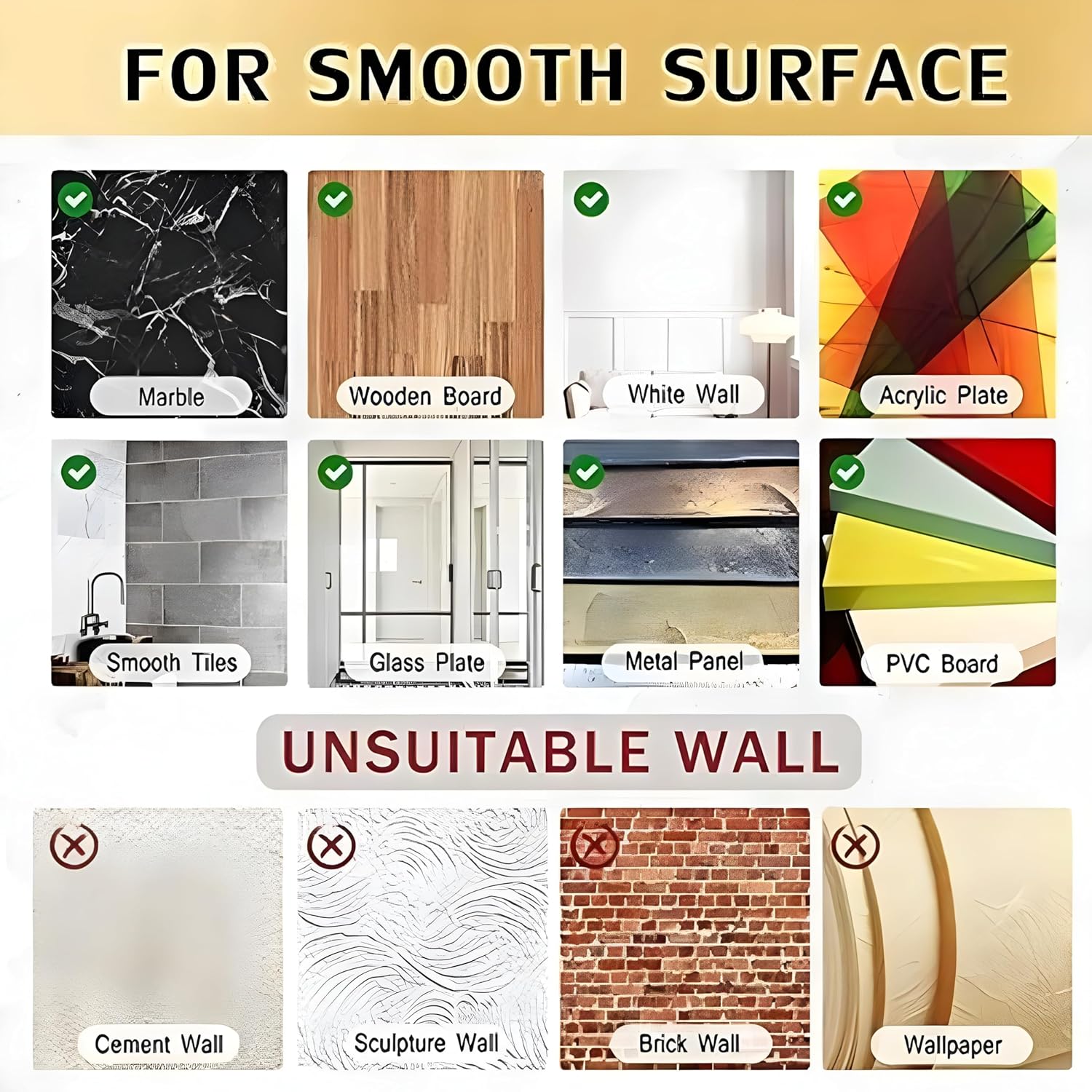 Please make sure the surface is clean and dry, free from dust, water and oil. Please confirm whether the adhesive hooks sticks firmly before hanging heavier objects or valuable items. The sticky hooks is not recommended for wallpaper wall, painted wall and drywall to avoid damaging as its strong adhesion, please make sure the position before use if you need.