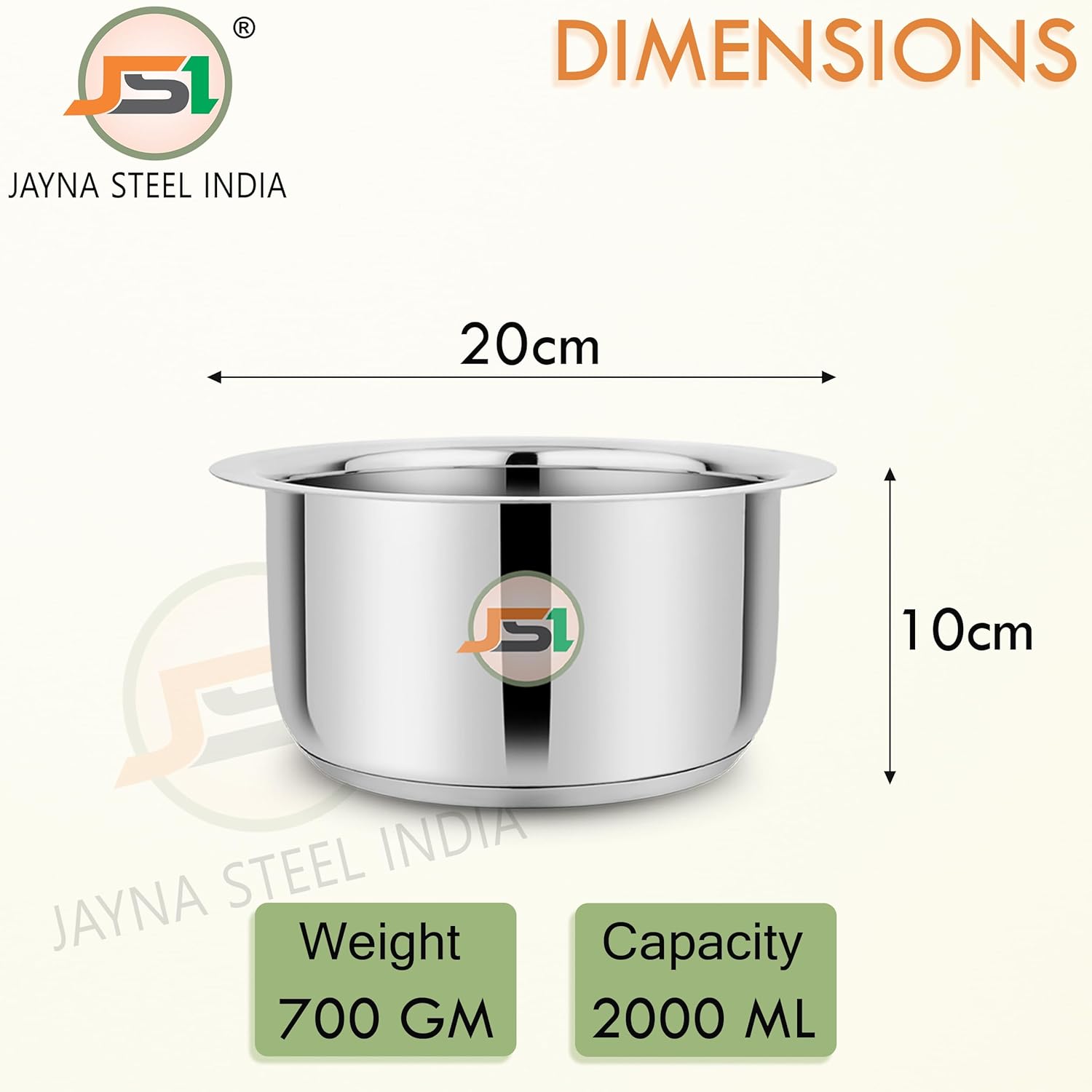 JSI Stainless Steel Milk Tope/Patila/Bhagona. Durable And Versatile Cookware For Everyday Use : The JSI Stainless Steel Milk Tope Is Designed To Make Your Cooking Easier And More Efficient. Made From 100% Food-Grade Stainless Steel, It Is Safe, Hygienic, And Long-Lasting. The Tri-Ply Sandwich Base Combines Three Layers – Food-Grade 18/8 Stainless Steel, Aluminum For Even Heat Distribution, And Magnetic SS 430 For Induction Compatibility ; Efficient Heating And Cooking : With A 3.5 MM Extra-Thick Tri-Ply Base, This Tope Ensures Even Heat Distribution From Base To Edge, Preventing Food From Burning Or Sticking. The Advanced Design Spreads Heat Up The Walls, Allowing Faster And Uniform Cooking While Saving Time And Energy. It Is Compatible With Induction, Gas, Electric, Ceramic, And Halogen Cooktops, Offering Great Flexibility In Your Kitchen, Making It Ideal For Boiling Milk, Cooking Rice, Heating Water, And Preparing Soups Or Curries. The Deep Body Design Prevents Spillage During Stirring, While Its Heavy Bottom Offers Stability And Durability; Rust-Free And Easy To Clean : Crafted With Export-Quality Stainless Steel, This Cooking Pot Is Rust-Resistant, Peel-Proof, And Unbreakable. Its Smooth Finish Makes It Easy To Clean And Dishwasher-Safe, Ensuring A Hassle-Free Cooking And Cleaning Experience; Convenient And Space-Saving : The Tope Features A Stackable Design That Saves Storage Space In Your Kitchen. Its No-Rivets Interior Makes Cleaning Effortless, And The Ezee-Pour Flange Allows You To Pour Liquids Without Spilling. The JSI Stainless Steel Milk Tope Combines Practicality, Durability, And Elegance, Making It A Must-Have For Every Modern Kitchen.