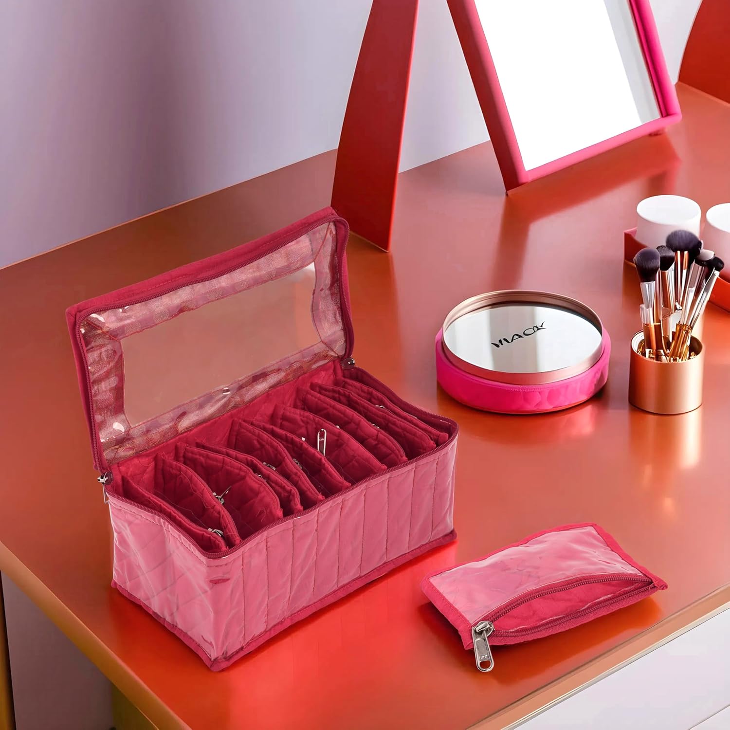 Customers find the jewelry storage kit perfect for organizing and storing various items, particularly kids’ and earrings, and appreciate its travel-friendly design that makes carrying jewelry hassle-free. The product receives positive feedback for its appearance, with one customer noting the beautiful brocade fabric, and customers consider it worth the price. The quality and pouch size receive mixed reviews – while some praise the zips and find it takes small space, others mention cheap materials and very small pouches.