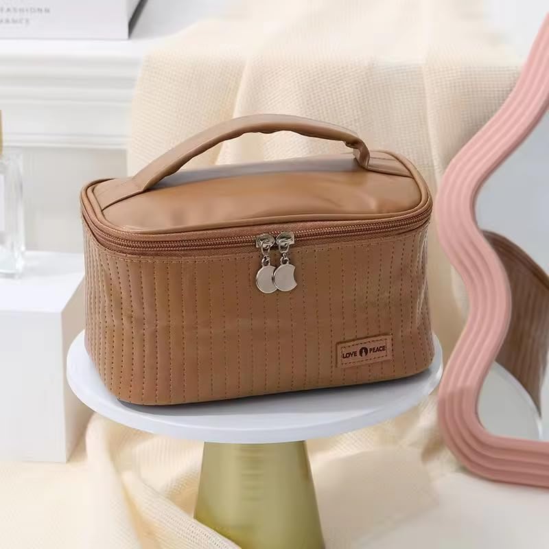 Creamy Texture Leather – Made from high-quality creamy texture leather, our makeup bag has a soft and luxurious feel that is a joy to touch and hold Wide Leather Handles – Our makeup bag comes equipped with wide leather handles that make it easy and comfortable to carry, even when it’s fully loaded with your favorite beauty essentials.Large Flip-Open-Top With its large flip-open top, our makeup bag provides ample space for all your makeup items and ensures that they are always within easy reach.