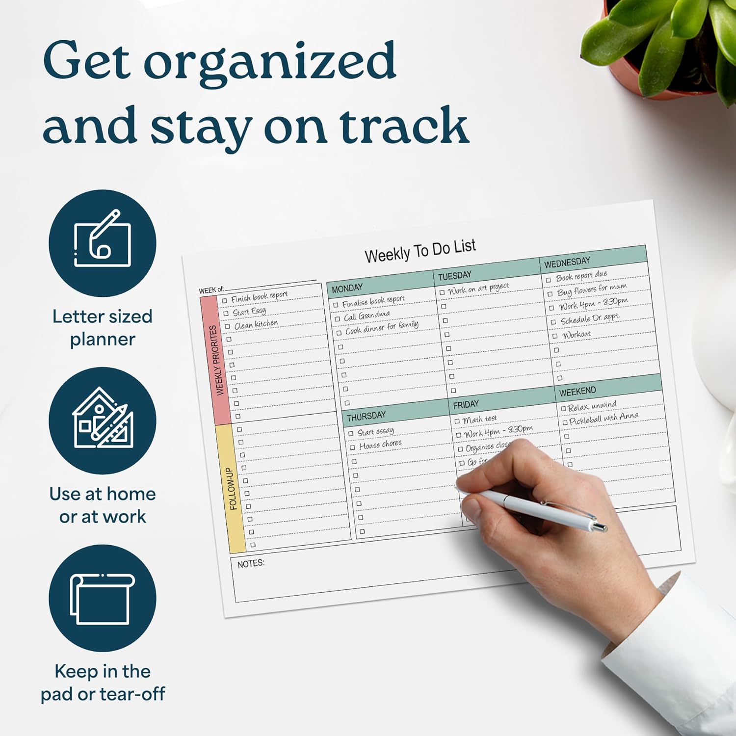 INCREASE YOUR PRODUCTIVITY. Weekly planner with matching notepad . This undated weekly planner pad with 54 tear-off sheets will have you more focused and productive than ever. A perfect size for a desk planner, the weekly notepad is 8.5 x 11 inches, providing plenty of room to track, organize and manage your schedule and weekly tasks. Matching 54 sheet notepad.