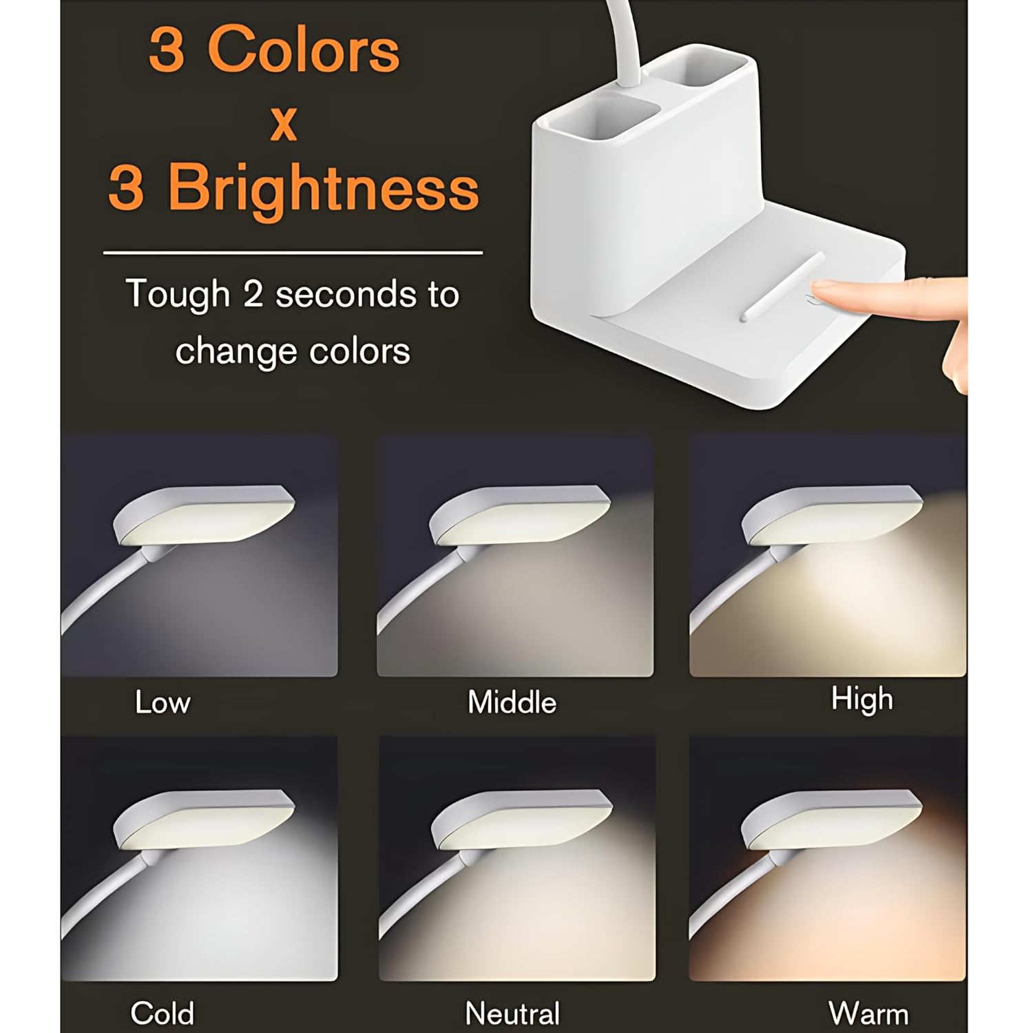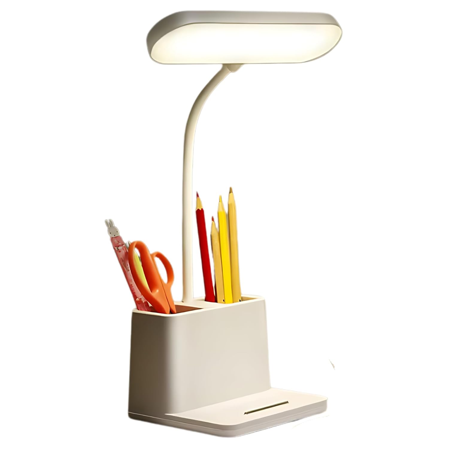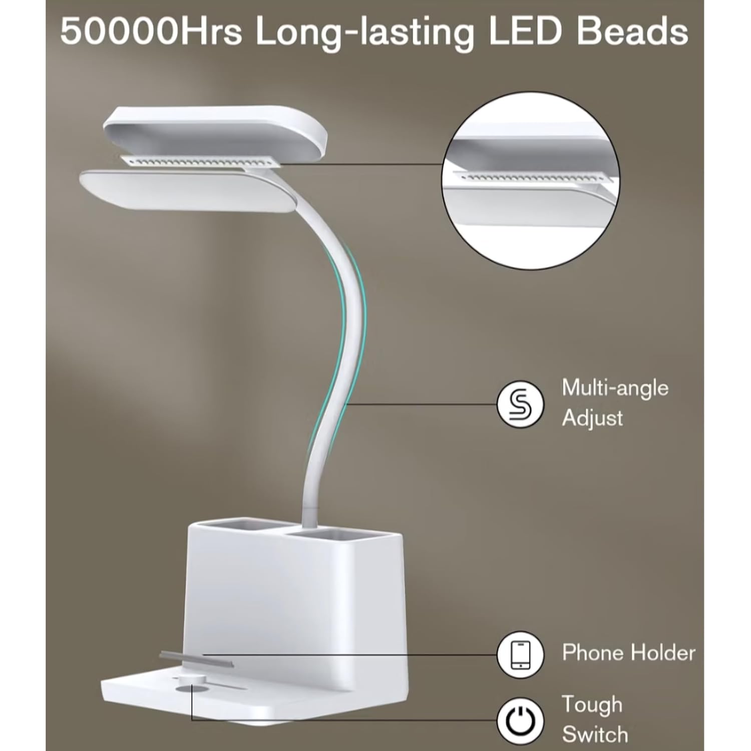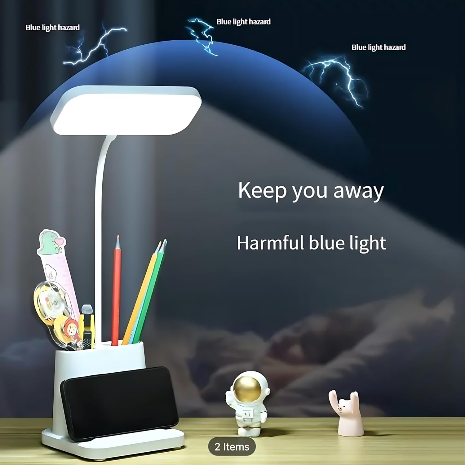 Combining utility and comfort, this eye-care LED desk lamp features adjustable brightness, a built-in organizer, and a phone holder all in one compact design. Perfect for home, school, or office, it helps streamline your workspace while protecting your eyes during long study or work hours.