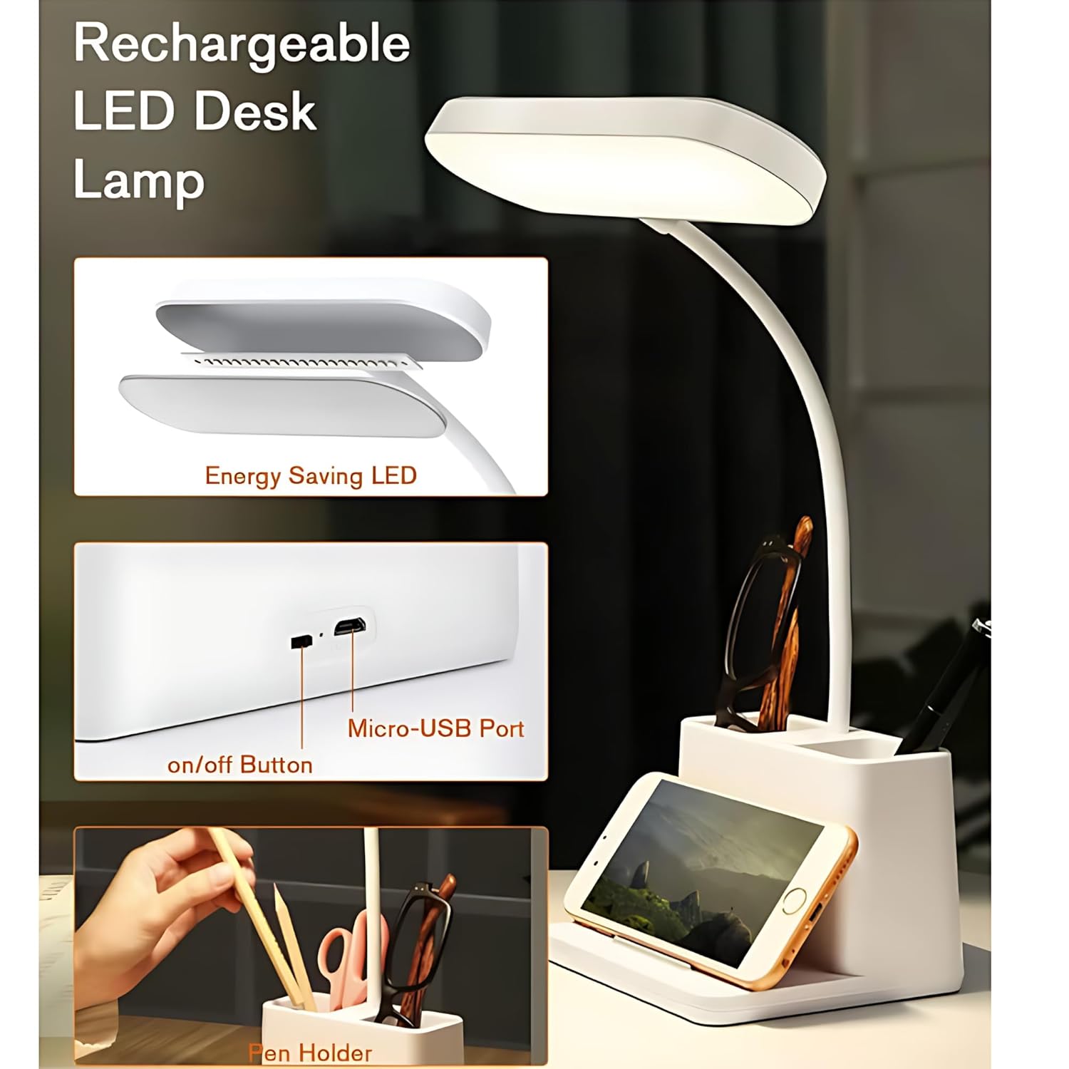 This multi-functional LED desk lamp features an energy-saving light, built-in pen holder, phone stand, and convenient Micro-USB charging. The sleek design includes a touch power button and flexible neck for optimal lighting angles. Stay organized and powered up perfect for modern workspaces and study zones.