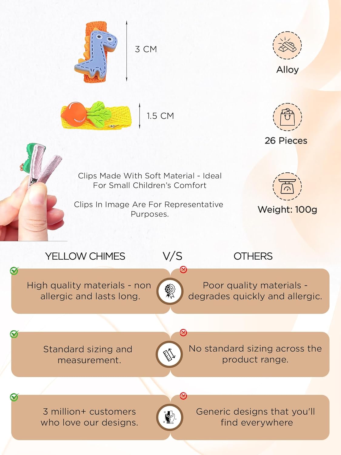 Pack of 26. Size: Length- 3 CM, Width- 1.5 CM. Closure type: Alligator clips.Comes in a storage Box for easy storage.