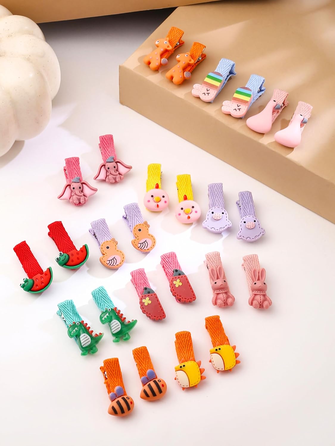 The pack includes 26 pcs Hair Clips for girls in multiple patterns kids hair accessories lovable characters in candy Colors. The Hair clips fro baby girls comes in a storage box for easy keeping.These hair clip will come in assorted patterns for you to match different outfits. You can change the styles frequently to make daily clothes charming and attractive.
