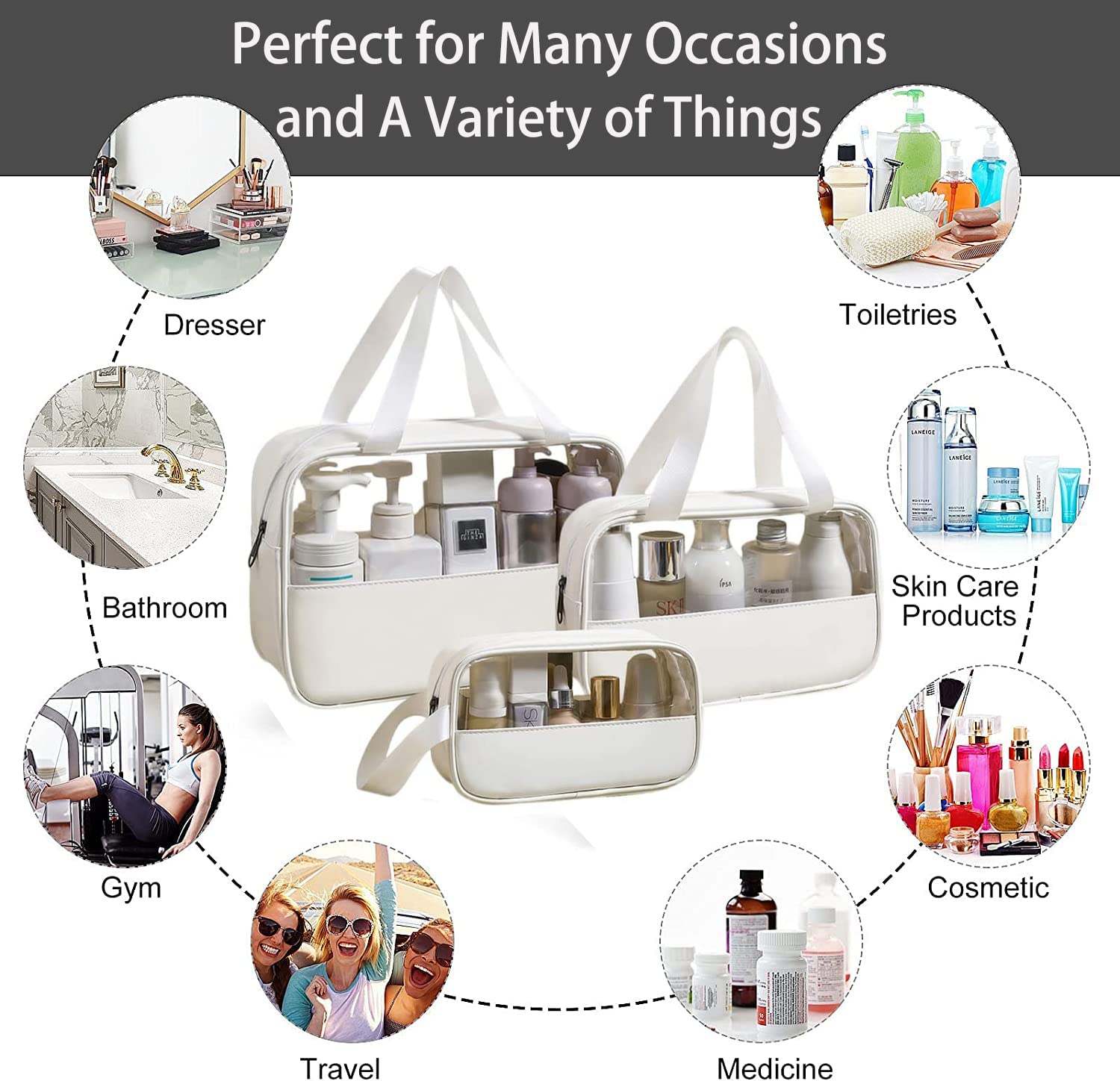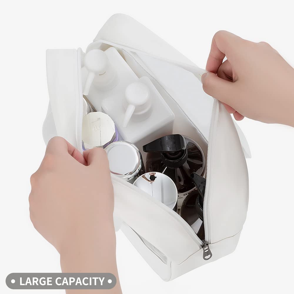 These travel makeup bags are made of PU and PVC material, durable, and waterproof. Design with translucent material and a large opening zipper, allows you to see what is stored and where it is and making it convenient to pack and save time to find what you need, The tote bag design with double handle and zipper allows you to carry a lot of daily necessities easily.