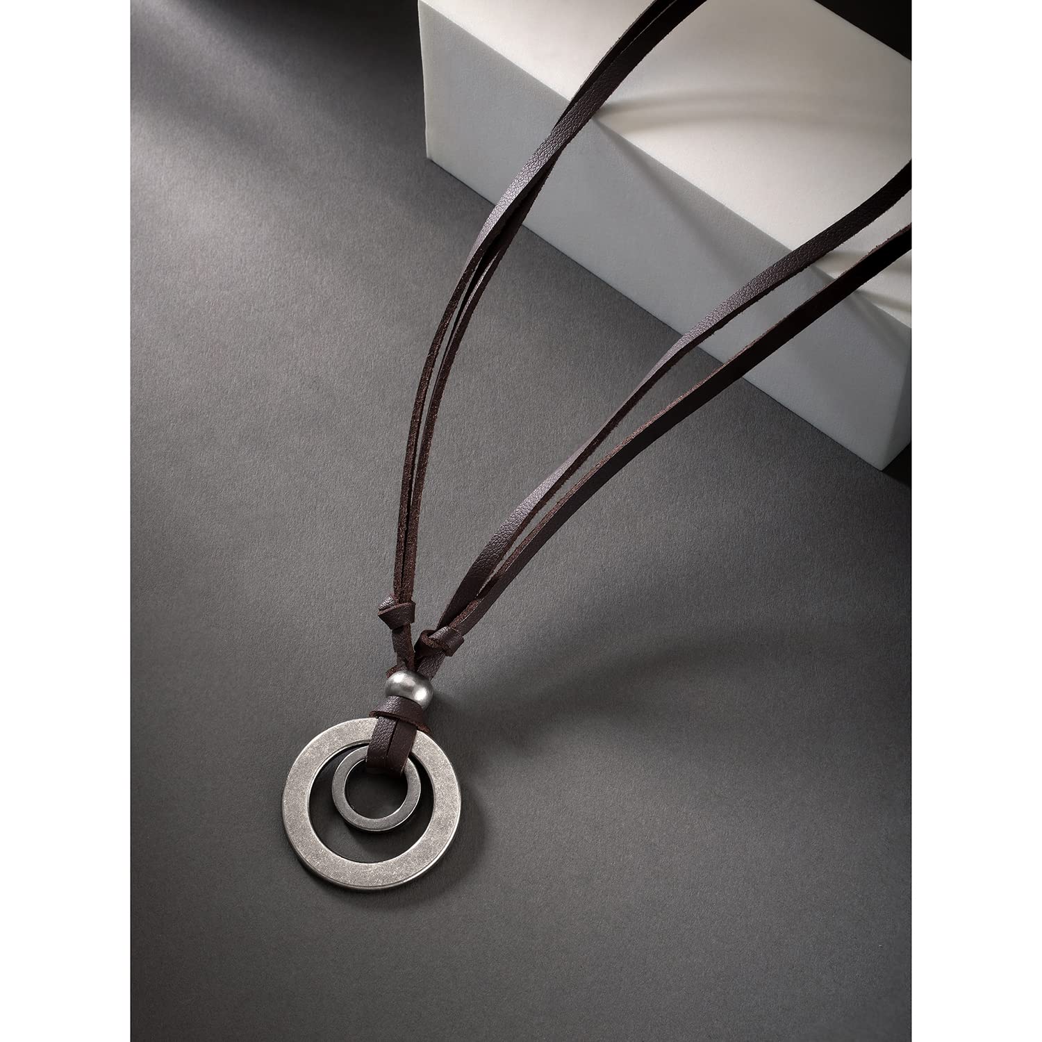 Customers find the necklace’s quality positive, with one mentioning it looks great with the metal ring. However, the material quality receives mixed feedback, with several customers noting the leather chain is flimsy. Additionally, customers express disappointment with the price, finding it could have been lower.