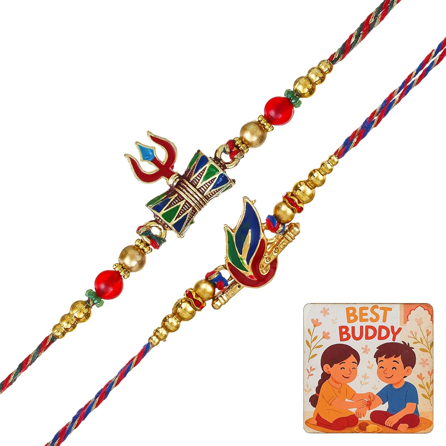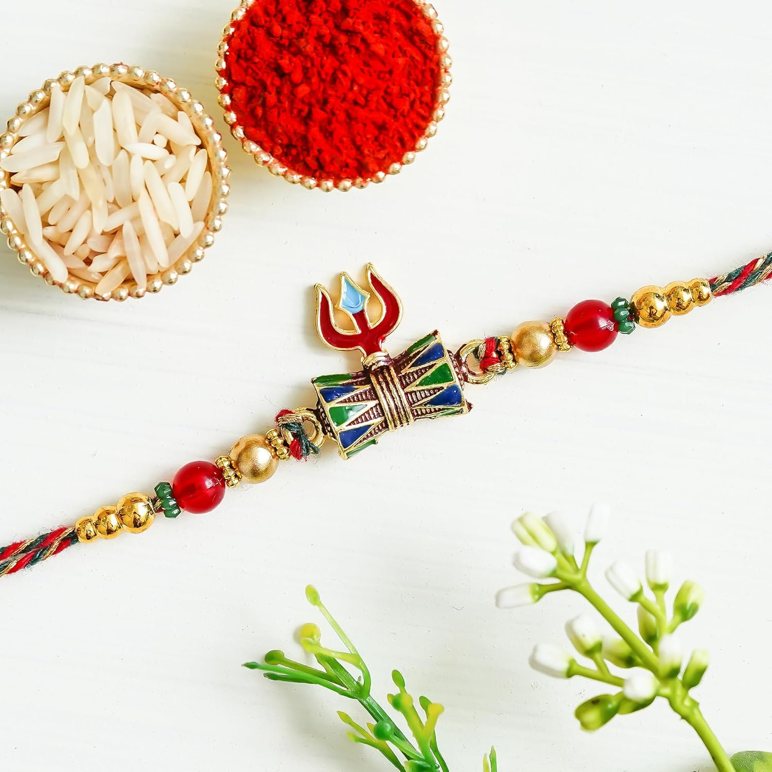 Celebrate Rakhi with this divine rakhi for brother, featuring sacred symbols of Lord Shiva. Intricately designed with vibrant beads, it’s a spiritual gesture of love this Rakshabandhan.