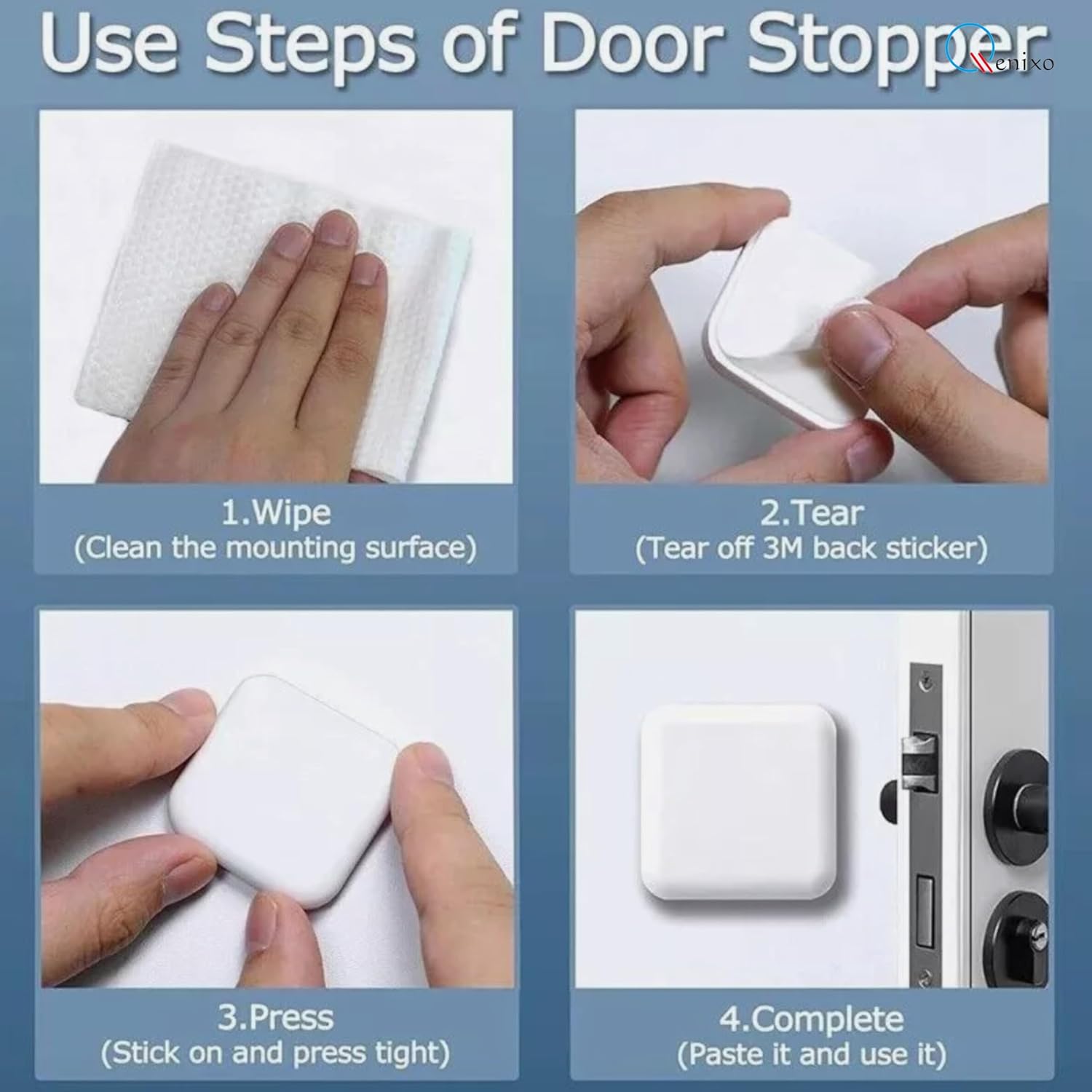 This QENIXO self-adhesive door stopper set of 4 door stoppers is perfect for fridge or cabinet doors, table corners, behind sofas, headboards, toilet seats. Use a doorman to protect doorknobs, doorknob slamming damage. Or use door stops as rubber feet for different devices and furniture.