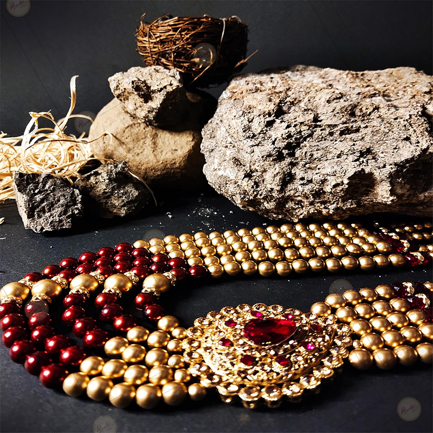 Add some style to your ensemble with this pearl set studded with maroon and Golden coloured pearls. Raadhe Creation’s beaded necklace features a side pendant embellished with maroon Kundan stones and imitation crystals.