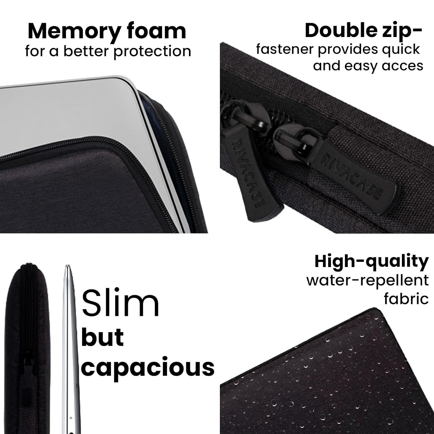 RIVACASE: Different shades of black that effortlessly blend and bold stitch lines which mirror your device’s edges give the sleeve a sense of solidity and purpose.