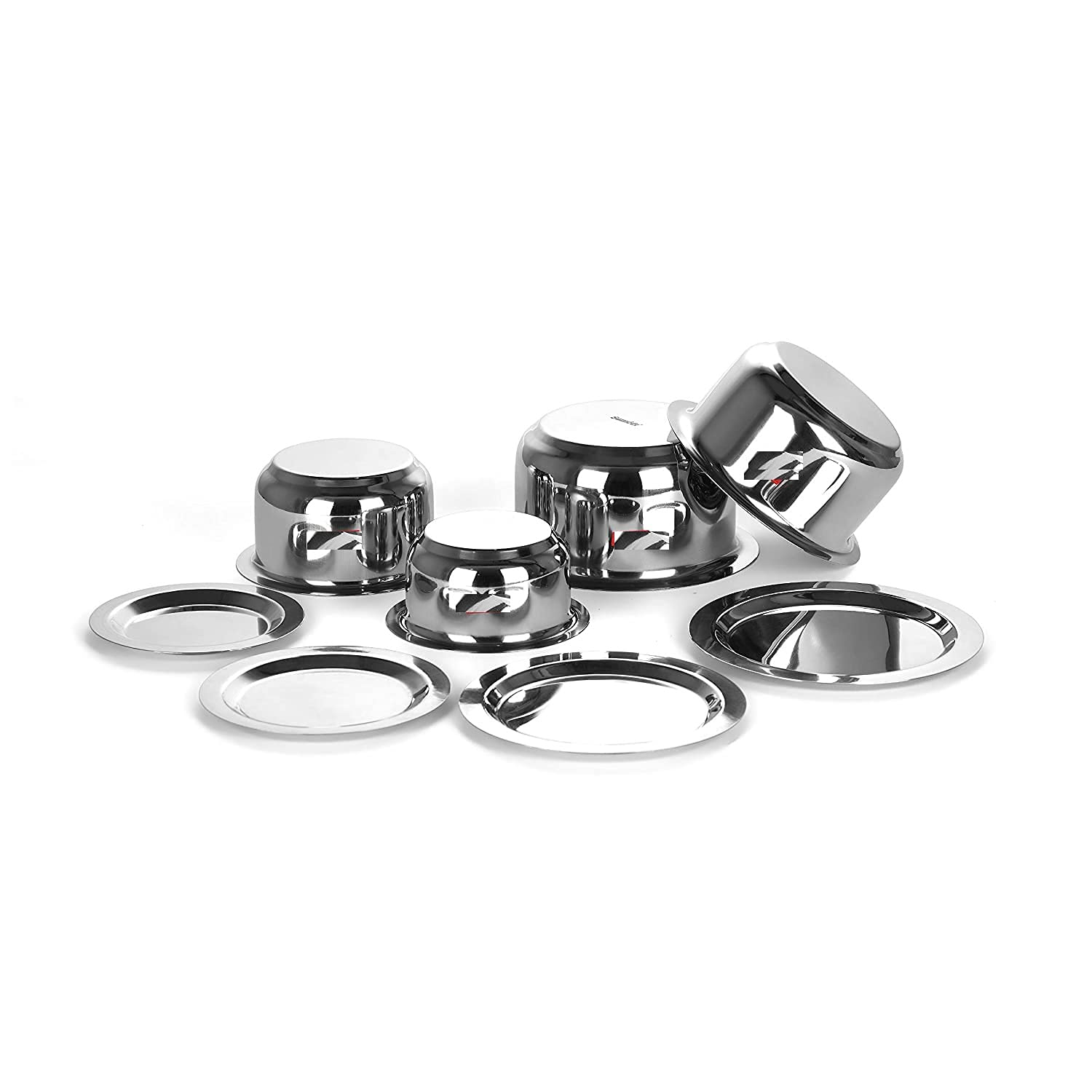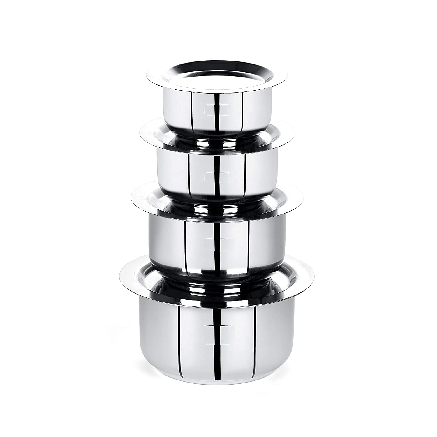 Cooking is one of the great pleasures of life & the right cookware is an essential ingredient for good cooking that’s why has brought together one of the most comprehensive ranges of quality cookware. Hence taking care of all your kitchen needs Stainless-Steel Rust-Free Cookware are carefully designed and fabricated with compliance with industry standards. This tope set is designed with flat bottom base that helps distribute heat evenly and quickly throughout the vessel and keeps the food in it warm for a longer duration. When not in use, the smaller container can be stacked inside bigger container saving a lot of storage space. This Set comes with Steel Lid for each with Matching Size, which helps in Fast cooking and saving Time and fuel. With a very fine finish, it Consumes low gas, cooks faster and looks great in kitchen. Another added feature is the base that allows the use of these Topes on an induction top as well as a gas stove. This quality cookware is extremely durable and fuel saver. Dishwasher Safe Exterior Adds Versatility and Functionality. It is easy to clean and maintain, even with everyday usage. Sure, to serve you well for a long time.