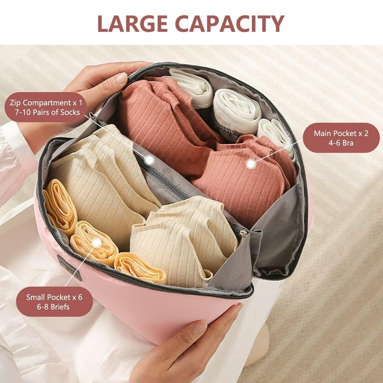Large Capacity : This bra bag has 2 large compartments for storing 4-6 bra, 6 small pockets for storing 6-8 briefs, 1 long pocket with zipper for storing 7-10 pairs of socks, which is large enough to fit your underwear, panties, bras, accessories, etc.
