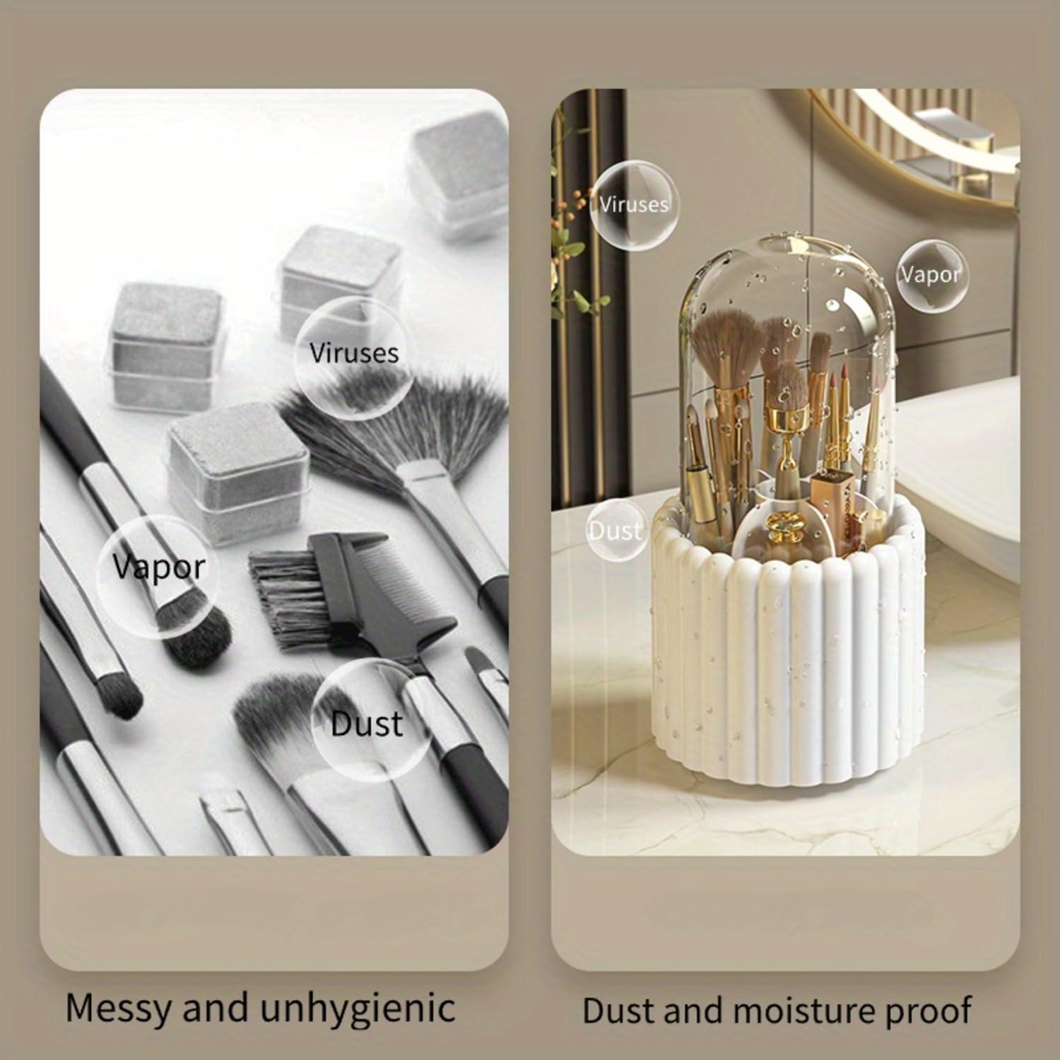 Dustproof & Easy to Clean: The Makeup brush holder with lid, high transparent lid to prevent from dirtying your makeup brushes, no dust on the brushes or makeup powder flying around, and easy to clean with a damp cloth.