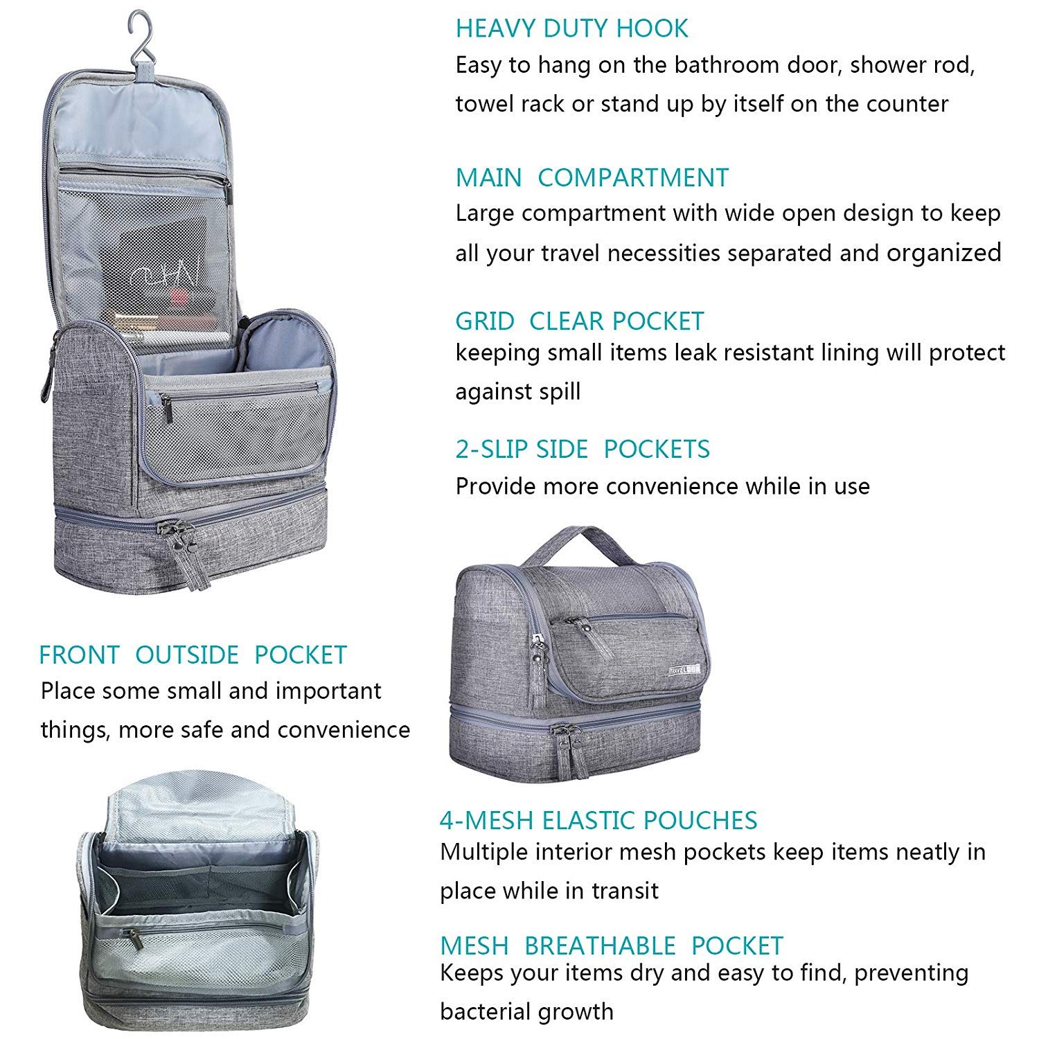 WATERPROOF DURABLE MATERIAL : This bag made of strong fabric can bring a good texture for this toiletry bag, Zippers are sturdy and all stitching is great, The fabric is thick and can be wiped down as needed, The specially treated fabrics can prevent water from splashing inside