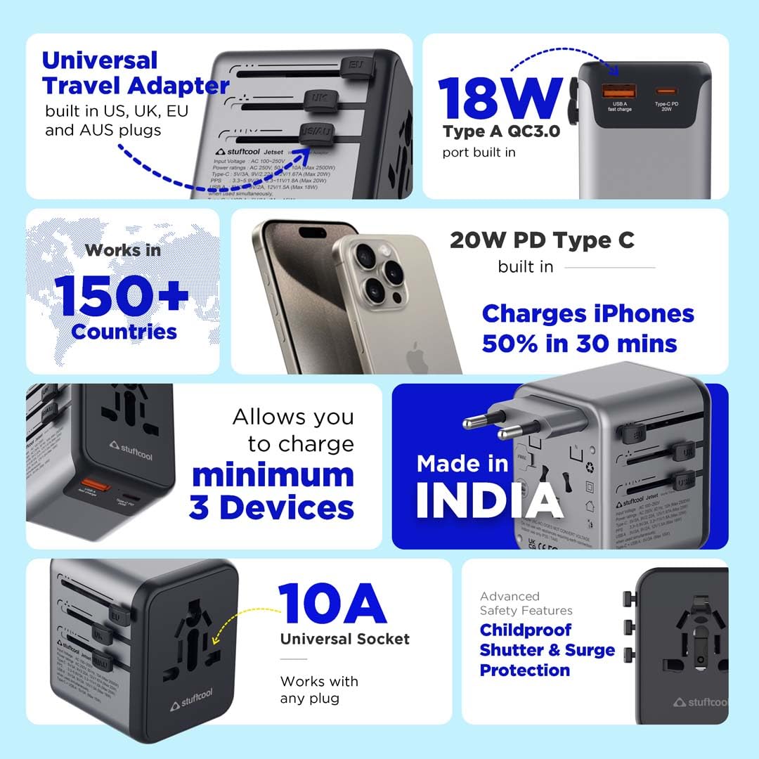 [Universal Socket For Universal Charging]:The Jetset features a Universal socket that lets you plug in any appliance (limited to 10A) having any country’s plug – allowing you complete freedom to power any and everything! The Type C and Type A ports are equipped with Power Delivery (20W) and QuickCharge 3.0 (QC3.0) fast charging protocols, allowing you to fast charge most personal devices