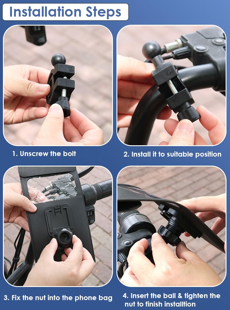 Easy to install and Disassemble: Convenient tool-free installation makes it easy to connect to handlebar, just locate and lock the nut. And the phone bag can be easily removed from the mounting bracket, so you can take it with you anytime.
