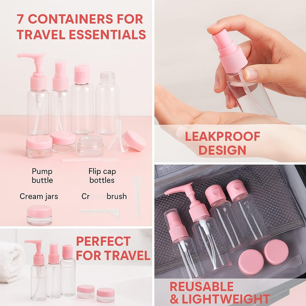 1. Complete Travel Toiletry Set – Includes refillable bottles and jars ideal for carrying sham-poo, lotion, conditioner, body wash, creams, and more. Perfect for air travel and short trips. 2. Leak-Proof & TSA Approved – Designed with secure, spill-proof caps to prevent leakage. TSA-compliant sizes make this kit carry-on friendly and stress-free at airports. 3. Compact & Lightweight – The kit fits easily into handbags, backpacks, or suitcases, making it a must-have for travel, gym, or daily use.