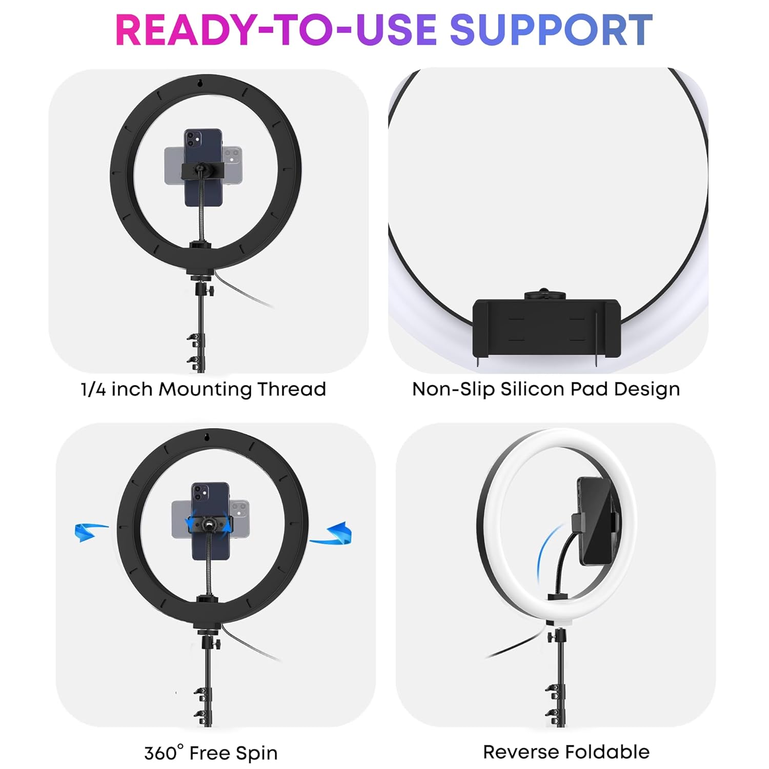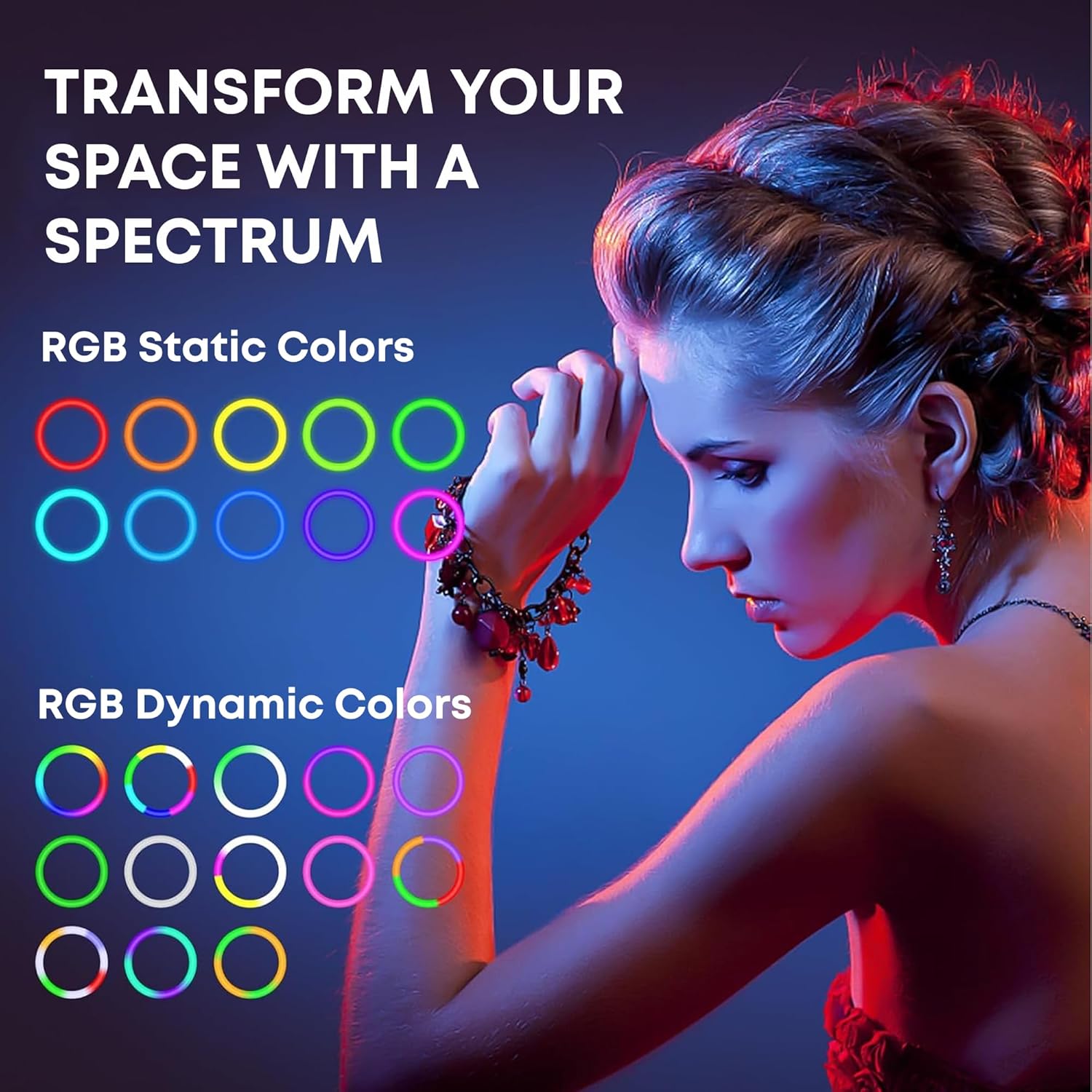 ENHANCED DIMMABLE RGB RING LIGHT: Featuring high-quality SMD LEDs and distinct lighting modes—Static Color and Dynamic Color—the dimmable LED ring light delivers superior illumination for enhancing facial features. Each lighting mode offers adjustable brightness levels, catering to diverse requirements across different settings and occasions