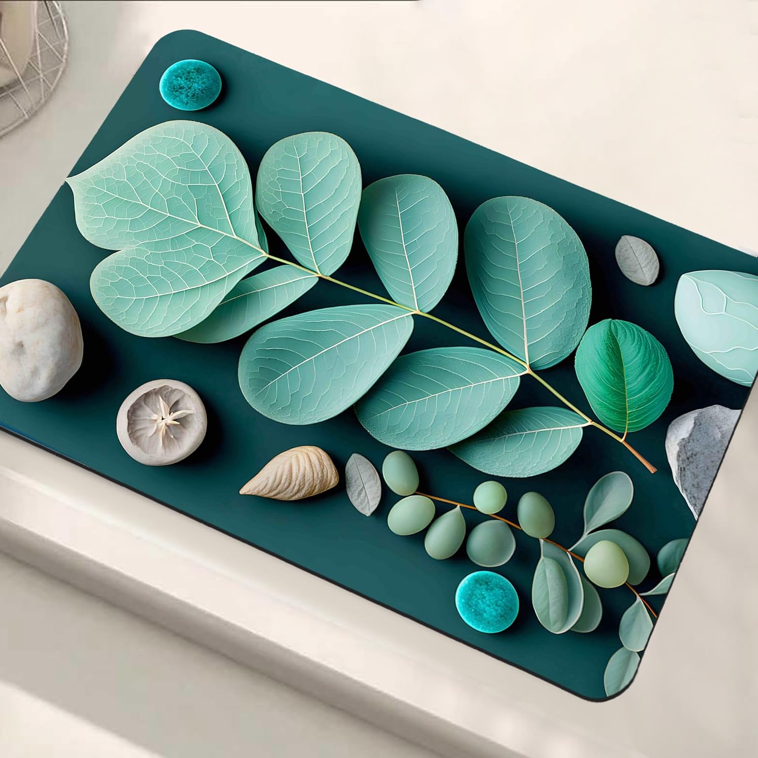 SIZE & COLOUR: The water soaking mat is backed by thick rubber (3mm) which stops water from penetrating the surface, Product Dimensions -58L x 38W cm, Color: 3D Green Leaf.